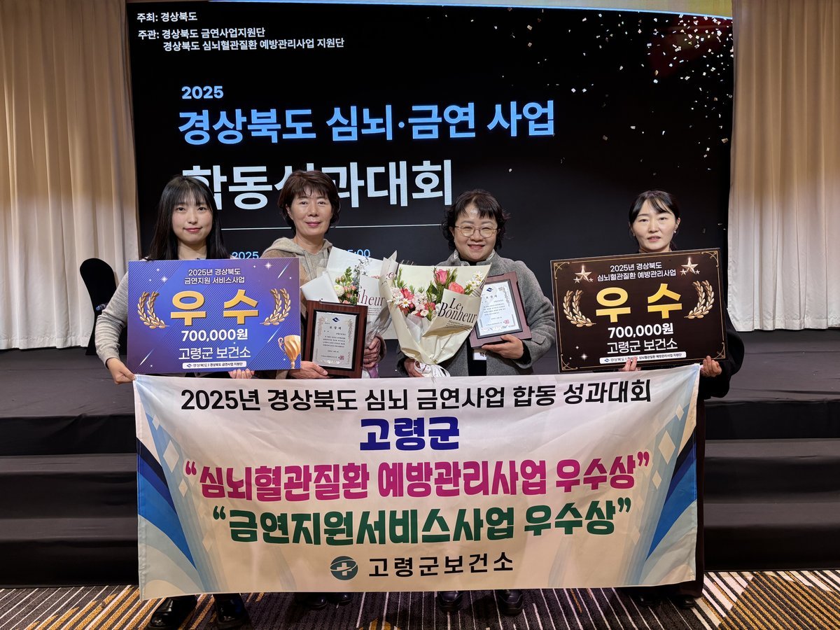 고령군 보건소가 경상북도 주관 '2025년 심뇌혈관질환 예방관리사업 및 금연사업 합동 성과대회'에서 우수 기관상을 동시에 수상하는 쾌거를 달성했다.이번 수상은 고령군이 심뇌혈관질환 예방과 금연 지원 분야에서 탁월한 성과를 거두었음을 인정받은 결과다. 경상북도 24개 보건소를 대상으로 한 평가에서 고령군은 정량 및 정성 평가 모두에서 높은 점수를 받았다.특히 금연지원서비스사업은 3년 연속 우수 기관상을 수상하며 고령군의 꾸준한 노력을 입증했다. 고령군은 관내 유치원, 어린이집, 초·중·고등학교 학생 1317명을 대상으로 흡연 예방 교육을 실시하고, 고령군 자율방범대와 협력하여 금연 서포터즈를 운영하는 등 적극적인 금연 사업을 추진했다.심뇌혈관질환 예방관리사업에서는 지역 주민을 대상으로 고혈압·당뇨 예방 관리법, 뇌졸중·심근경색 조기 증상 교육을 실시하고, 레드서클존을 활성화하여 만성질환자 조기 발견에 힘썼다. 이러한 노력은 지역 주민의 건강 증진에 크게 기여했다는 평가를 받았다.고령군 보건소장은 앞으로도 심뇌혈관질환 예방관리사업과 금연지원서비스사업을 더욱 활발하게 추진하여 관내 주민들의 건강 증진에 최선을 다할 것이라고 밝혔다.