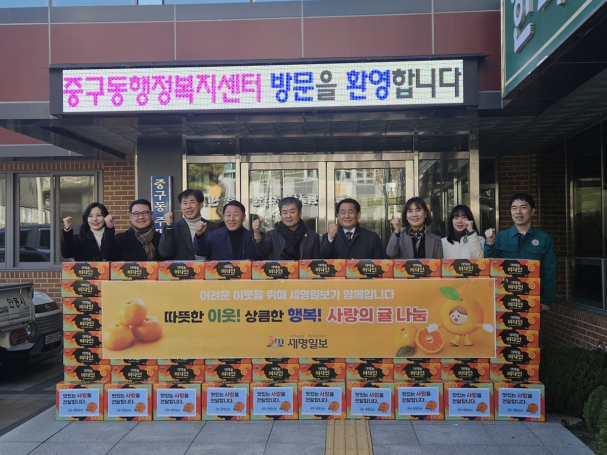경상북도 지역 언론사인 세명일보가 지난 3일, 중구동행정복지센터에 사랑의 귤 100박스를 기탁하며 지역사회에 따뜻한 온정을 전했다.이번 기탁은 세명일보가 '따뜻한 이웃, 상큼한 행복, 사랑의 귤 나눔'이라는 취지로 마련한 행사다. 연말연시를 맞아 지역사회에 활력을 불어넣고, 어려운 이웃들에게 따뜻한 마음을 전달하고자 기획됐다.세명일보는 이번에 전달된 귤 100박스를 중구동 내 취약계층 가구와 복지 사각지대에 놓인 주민들에게 우선적으로 배부할 예정이다.조덕수 세명일보 사장은 “취재 과정에서 어려움을 겪는 이웃들을 자주 접하게 된다”며 “작은 정성이지만 주민들에게 따뜻한 위로와 기쁨이 되기를 바란다. 앞으로도 지역사회와 함께하며 사람들의 이야기에 귀 기울이는 언론사로 남겠다”고 밝혔다.장명숙 중구동장은 “세명일보의 꾸준한 관심과 사랑 덕분에 주민들에게 따뜻한 마음을 전할 수 있게 되어 매우 감사하다”며 “기탁된 물품이 꼭 필요한 분들에게 잘 전달될 수 있도록 최선을 다하겠다”고 말했다.세명일보는 이번 사랑의 귤 나눔 외에도 지역사회의 어려움을 살피고 꾸준히 지원해왔다. 단순한 물질적 지원을 넘어 주민 간 유대감을 높이고 따뜻한 나눔 문화를 확산하는 데 지속적으로 기여할 계획이다. -