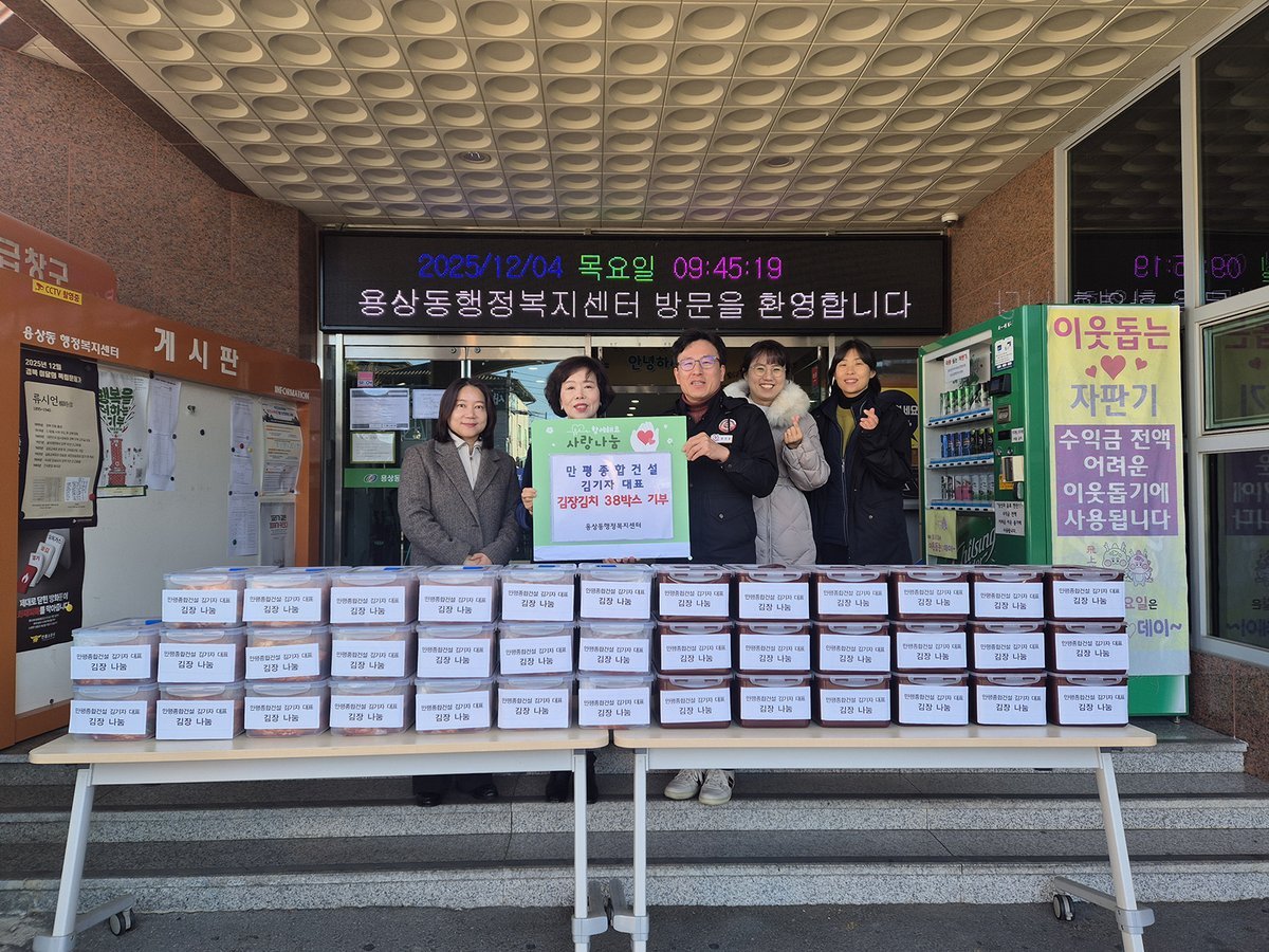 만평종합건설 김기자 대표가 연말을 맞아 직접 담근 김장 김치를 용상동 관내 경로당 38곳에 전달하며 따뜻한 온정을 나눴다.김 대표는 4일 용상동행정복지센터를 방문해 김치 38박스를 기부했다. 이번 기부는 지역사회와의 상생을 중요하게 생각하는 김 대표의 뜻에 따라 추진됐다.김 대표는 홀로 거주하거나 경제적으로 어려움을 겪는 어르신들이 갓 담근 김치로 따뜻한 겨울을 보내기를 바라는 마음을 전했다.김 대표는 “정성껏 만든 김치를 통해 어르신들의 식탁이 조금이나마 풍성해지기를 바란다”며 “앞으로도 지역사회를 위한 나눔 활동에 적극적으로 참여하겠다”고 밝혔다.황성웅 용상동장은 “소외된 이웃을 위해 따뜻한 손길을 보내주신 김기자 대표께 깊이 감사드린다”며 “전달된 김치는 경로당에 잘 전달하겠다”고 말했다.한편 김기자 대표는 법무부 법무보호 경북지부회장과 안동시 시각장애인 후원회장을 역임하며 평소 장애인들의 사회 참여 확대를 위해 후원하는 등 사회에 귀감이 되고 있다. -
