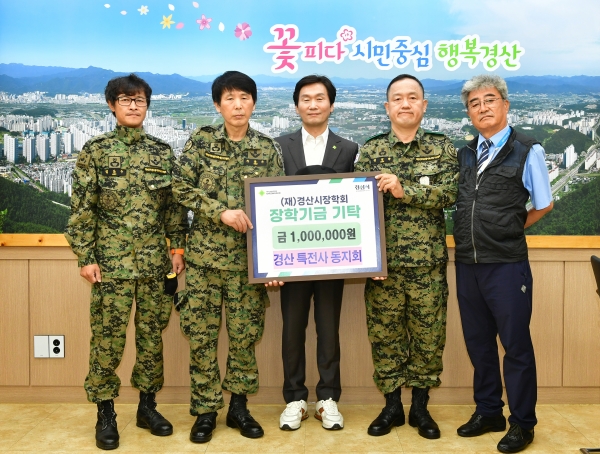 경산시장학회는 9일 경산 특전사 동지회 가 지역인재 육성을 위한 장학금 100만원을 기탁했다고 밝혔다. 김경환 지회장은 “회원들이 십시일반 모은 민생 회복 쿠폰으로 장학기금을 마련하게 되어 뜻을 함께 해준...