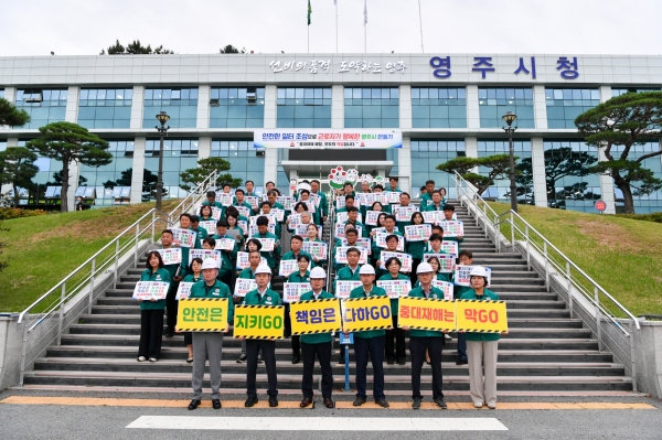 영주시는 지난 8일 시청 전정에서 ‘중대재해 제로화를 위한 3Go 캠페인’을 열고 안전한 근로환경 조성에 대한 의지를 다졌다. 이번 캠페인은 중대재해를 예방하고 안전한 일터를 만들기 위해 마련됐으며 전 부서...
