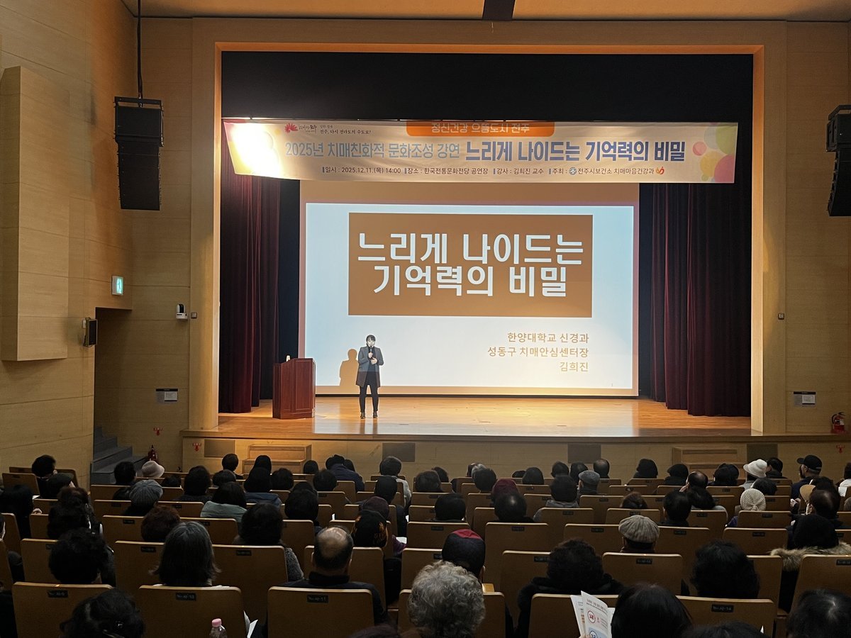 전주시가 문화강연을 통해 모두가 행복한 치매 친화 도시를 만드는 데 앞장서고 있다.전주시보건소 치매안심센터는 11일 한국전통문화전당 2층 공연장에서 치매파트너와 일반시민 등 200여 명을 대상으로 치매친화적 문화 조성을 위한 강연을 개최했다.치매에 대한 이해를 바탕으로 지역에서 치매환자와 가족을 배려하고 지원하는 역할을 수행하는 시민 봉사자인 치매파트너의 역량을 향상하고, 지속적인 활동 참여를 독려하기 위해 마련된 이날 강연에는 김희진 한양대학교 신경과 교수가 강사로 초청돼 ‘느리게 나이 드는 기억력의 비밀’을 주제로 강연했다.이 자리에서 김희진 교수는 △노화의 정의 △신체 나이보다 젊은 두뇌의 비밀 △두뇌건강루틴 만들기 등 치매 예방과 기억력 관리에 대한 실용적인 정보를 제공했다.특히 김 교수는 “뇌 관리를 소홀히 해 고통받는 환자들을 상담하면서 건강한 두뇌 습관을 일상화하는 것만으로도 충분히 뇌가 좋아지고 치매가 예방되는 것을 보았다”면서 생활 속에서 누구나 쉽게 따라 할 수 있는 두뇌 관리 실천법을 제시했다. 또, 치매파트너의 역할을 강조했다.강연에 이어 질의응답도 이어졌다. 치매파트너로 활동 중인 시민들은 치매 예방을 위한 건강 습관에 대해 많은 관심을 나타냈으며, 강연을 통해 활동 현장에서 바로 적용할 수 있는 지식을 배우기도 했다.이와 관련 전주시 치매안심센터는 치매에 대한 인식을 개선하고, 치매환자 및 가족에 대한 공감과 지지 문화를 확산하기 위해 올해 복지관과 경로당, 학교 등 다양한 기관에 찾아가 총 1만22명을 대상으로 273회에 달하는 치매예방교육과 강연을 실시했다.센터는 또 치매 가구의 경제적 부담을 줄이고 촘촘한 치매안전망을 구축하기 위해 △치매 무료 조기 검진 △감별검사비 지원 △전시민 치매 선별검사 및 진단검사 지원 △치매 치료 관리비 지원 △조호물품 지원 △치매환자 맞춤형 사례 관리 운영 △배회 치매환자 실종 예방 지원 △치매안심가게 및 치매극복선도단체 지정 △치매파트너 양성 △치매안심마을 운영 등 다양한 사업을 추진하며 치매로부터 안전한 전주 만들기에 앞장서고 있다.김신선 전주시보건소장은 “지속적인 교육을 통해 지역사회가 함께 치매를 이해하고 돕는 환경을 만드는 것이 무엇보다 중요하다”면서 “앞으로도 시민과 함께 치매친화적인 문화 조성을 위해 다양한 강연과 프로그램을 확대해 나가겠다”고 말했다. -