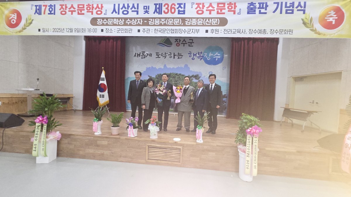 장수군이 지역 문학인들의 창작 활동을 장려하고 문학 발전에 기여하기 위해 제7회 장수문학상 시상식과 장수문학 제36집 출판 기념식을 성황리에 개최했다.이번 행사는 지역 문인과 독자, 문화 관계자 등 50여 명이 참석하여 장수 문학의 성과를 공유하고, 지속 가능한 창작 환경 조성에 대한 기대를 높였다.한국문인협회 장수군지부 주관으로 열린 이번 행사는 장수군민회관에서 진행되었으며, 개회 및 국민의례를 시작으로 내빈 소개, 인사말, 장수문학상 운영 경과 보고, 심사평 순으로 이어졌다.올해 장수문학상은 김종윤 수필가와 김용주 시인이 수상의 영예를 안았다. 두 수상자는 장수문학에 게재한 작품을 통해 문학적 완성도와 창작 의지, 지역 문학 발전에 대한 기여도에서 높은 평가를 받았다.시상식 후에는 축사와 수상자 소감 발표, 장수문학 제36집 봉정식이 진행되었으며, 참석자 전원이 기념 촬영을 하며 행사를 마무리했다.조방희 한국문인협회 장수군지부 회장은 “이번 출판 기념식이 장수 지역 문인들의 창작 활동을 응원하고 지역 문학의 저변을 넓히는 뜻깊은 자리였다”고 평가하며, “앞으로도 문학을 통해 지역 문화가 더욱 풍성해질 수 있도록 노력하겠다”고 밝혔다.장수군은 장수문학 발간과 장수문학상 시상식이 지역 문화 정체성을 기록하고 미래 세대에 창작 환경을 전달하는 데 중요한 역할을 할 것으로 기대하고 있다. 또한, 문학 활동을 통해 지역 주민의 문화적 자긍심을 높이는 데에도 기여할 것으로 전망한다. -