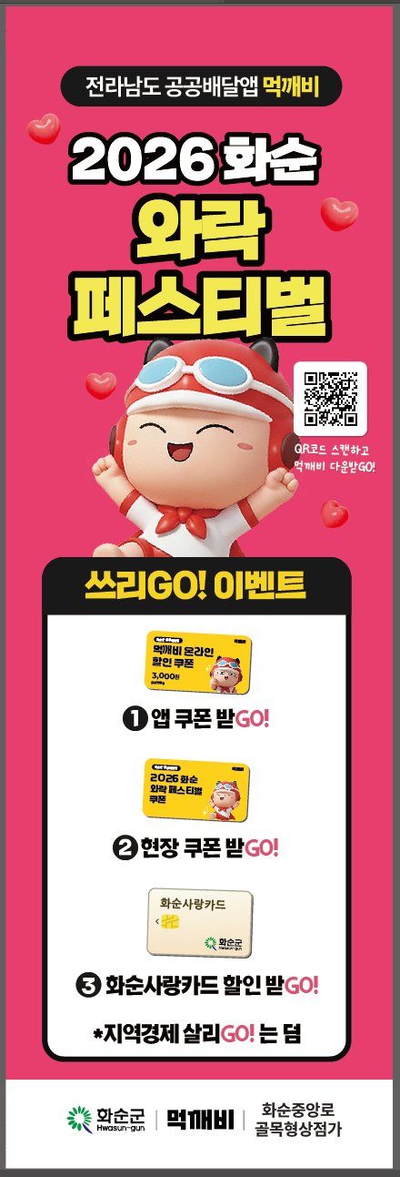 화순군이 오는 5월 초 열리는 지역 대표 축제 '2026 화순 와락 페스티벌'과 연계해 공공배달앱 '먹깨비' 할인 이벤트를 전개한다. 가정의 달을 맞아 소비를 촉진하고 침체된 골목 상권에 활...