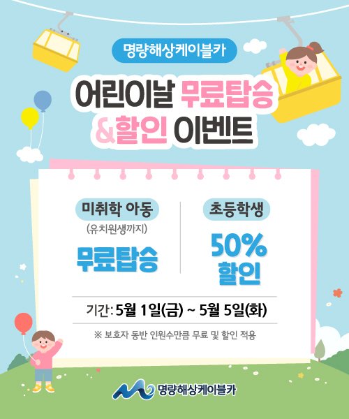 전남 해남과 진도를 잇는 명량해상케이블카가 어린이날을 맞아 가족 관광객들을 위한 특별한 탑승 혜택을 마련했다. 5월 1일부터 5일까지 이어지는 징검다리 연휴 기간, 미취학 아동은 무료로, 초등학생은 50% 할...