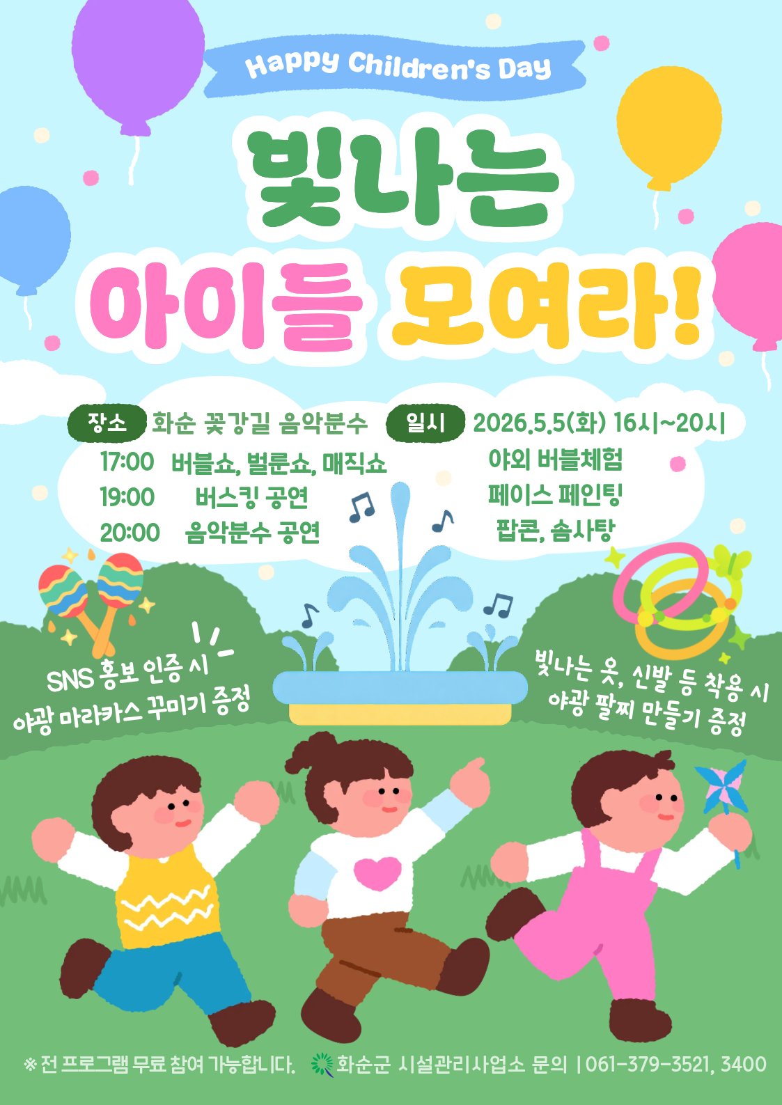 화순군이 어린이날을 맞아 전 세대가 함께 즐길 수 있는 대규모 체험형 축제를 마련한다. 오는 5월 5일 남산공원과 꽃강길 음악분수대 일원에서 오전부터 밤까지 다채로운 프로그램이 펼쳐지며, 아동친화도시로서...