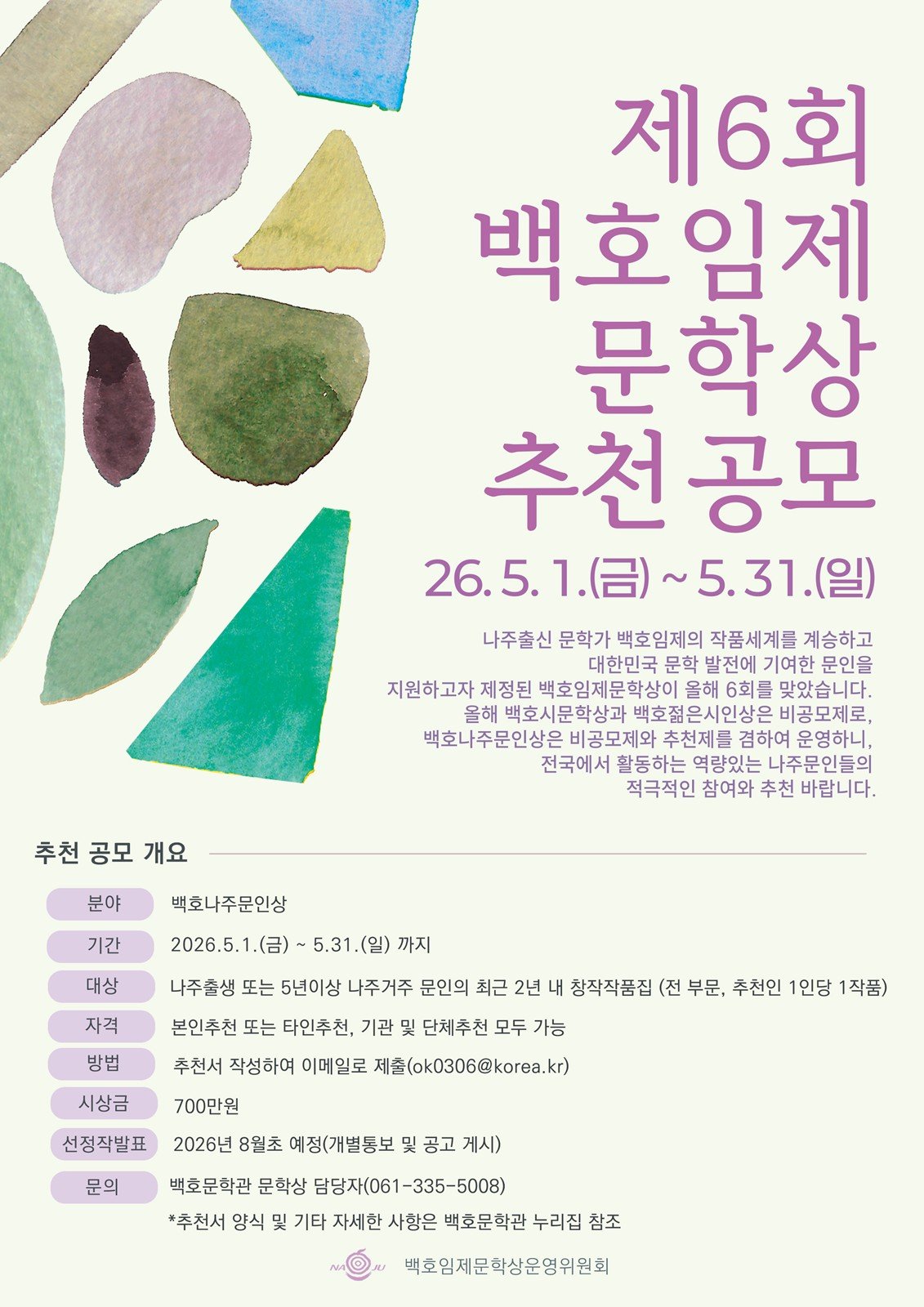 전남 나주시가 지역 문학 활성화와 역량 있는 문인 발굴을 위해 제6회 백호임제문학상 백호나주문인상 후보작 추천 공모를 시작했다. 특히 올해는 추천제를 병행하고 시상금을 상향하는 등 제도 개선을 통해 문학...