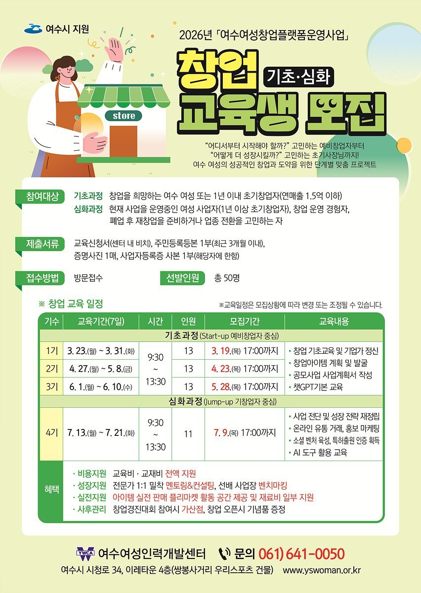 여수시는 여성의 창업 역량을 강화하고 지역경제 활성화를 위해 3월부터 ‘여수 여성 창업플랫폼 사업’을 추진한다고 밝혔다.이 사업은 창업을 희망하는 예비 창업자와 초기 창업자를 대상으로 △창업 기초·심화 교육 △1:1 멘토링 및 전문가 컨설팅 △벤치마킹 △창업 플리마켓 지원 △창업경진대회 등 원스톱 창업지원 체계를 구축하는 데에 목표로 추진 된다.특히 올해는 창업 교육을 신규 창업자를 위한 기초과정과 기 창업자를 위한 심화 과정으로 구분해 운영한다. 창업 기초교육부터 특허출원, 인증, 홍보·마케팅까지 창업 아이템의 전문화와 고도화를 집중 지원할 계획이다.또한 창업경진대회를 통해 예비 여성창업자의 초기 창업자금을 지원하고, 향후 사업화 자금 및 전문가 컨설팅을 연계해 단계별 성장지원 시스템을 강화할 예정이다.시 관계자는 “초기 창업 과정에서 다양한 어려움을 겪는 사례가 많은 만큼 기초 역량을 탄탄히 다지는 기회가 되길 바란다”며 “지역 특성에 맞는 유망 창업 아이템 발굴과 지속 가능한 창업 생태계 조성을 위해 적극 지원하겠다”고 말했다.창업준비교육 1기는 3월 19일까지 모집하며 교육은 3월 23일부터 3월 31일까지 진행된다.세부 지원 내용은 여수시청 누리집 또는 여수여성인력개발센터 누리집에서 확인할 수 있다.