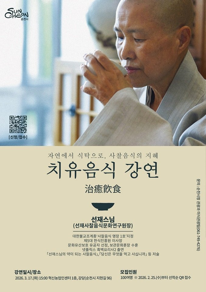 순천시가 ‘2026 순천미식주간’ 개최를 앞두고, 치유음식 문화 확산과 시민 참여 분위기 조성을 위한 특별 강연을 개최한다.시는 오는 3월 17일, 사찰음식 명장 제1호인 선재스님을 초청해 ‘자연에서 식탁으로, 사찰음식의 지혜’를 주제로 강연을 진행한다. 이번 강연은 사찰음식이 지닌 치유의 의미와 제철 식재료의 생명력, 그리고 음식을 통해 몸과 마음을 다스리는 철학을 중심으로 구성될 예정이다.특히 이번 강연은 단순한 조리법 전수를 넘어, 순천의 건강한 식재료를 어떻게 브랜드화하고 미식 가치를 높일 것인지에 대해 지역 외식업 종사자들에게 깊은 영감을 줄 것으로 기대된다.오는 25일부터 선착순 100명을 대상으로 모집하는 이번 강연은 외식업 종사자와 시민 누구나 홍보물에 포함된 QR코드를 통해 온라인으로 간편하게 신청할 수 있다. 구체적인 사항은 순천시 홈페이지 및 공식 SNS 채널에서 확인 가능하다.시 관계자는 “이번 강연은 치유음식의 가치를 알리고, 지역 외식업 종사자와 시민이 함께 공감할 수 있는 식문화 기반을 다지기 위해 마련됐다”며, “오는 6월 개최될 ‘2026 순천미식주간’ 본행사에도 많은 관심과 성원을 부탁드린다”고 말했다.한편, ‘2026 순천미식주간’은 순천의 풍부한 식재료와 고유한 음식문화를 알리는 지역 대표 미식 행사로, 오는 6월 다채로운 프로그램과 함께 본격적인 막을 올릴 예정이다.
