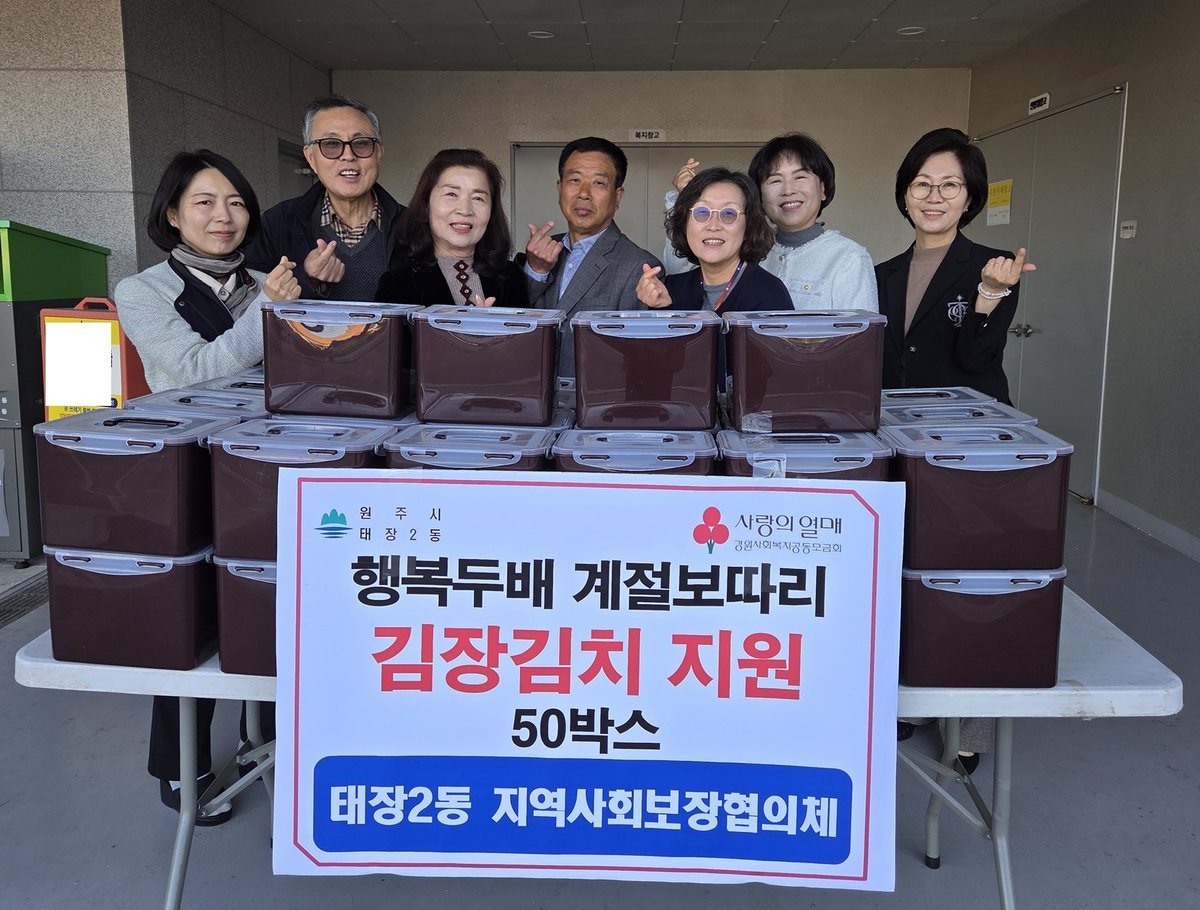 원주시 태장2동지역사회보장협의체가 지난 10일, 관내 취약계층을 위한 김장김치 50박스를 태장2동 행정복지센터에 기탁했다.어려운 이웃들이 따뜻한 겨울을 보낼 수 있도록 돕기 위한 나눔이다.이번 김치 나눔은 협의체의 '행복두배 보따리' 특화사업의 일환으로 진행되었다.협의체 위원들은 김장을 직접 하기 어려운 저소득층 50가구를 직접 방문하여 김장김치 7kg을 전달하고, 건강과 안부를 확인했다.오원택 민간위원장은 소외된 이웃들의 따뜻한 겨울나기를 지원하고 이웃사랑을 실천하고자 김장김치를 준비했다고 밝혔다.더불어 앞으로도 지역 내 어려운 이웃을 위해 지속적인 봉사와 나눔을 실천할 것을 약속했다.김영자 태장2동장은 김장김치 전달을 통해 깊은 온정을 나눌 수 있어 기쁘다는 소감을 전했다.또한 관내 홀몸 어르신들과 취약계층이 건강하게 겨울을 보낼 수 있도록 지속적으로 살피겠다고 덧붙였다.
