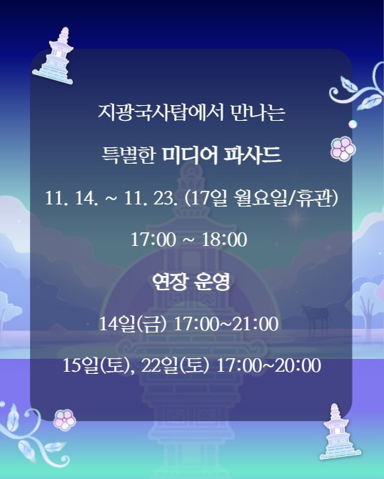 원주시역사박물관이 법천사지 유적전시관에서 지광국사탑 미디어파사드 전시를 14일부터 23일까지 진행한다.이번 전시는 국가지정유산인 법천사지와 지광국사탑, 지광국사탑비의 역사적, 문화적 가치를 널리 알리기 위해 기획됐다.미디어파사드는 빛과 영상 기술을 활용해 건축물 외벽에 다양한 콘텐츠를 투사하는 예술 기법이다.이번 전시에서는 지광국사탑의 아름다움을 극대화하고, 법천사지의 역사적 의미를 시각적으로 전달하는 데 초점을 맞췄다.전시 기간은 14일부터 23일까지이며, 관람 시간은 오후 5시부터 6시까지다.다만, 17일은 휴관이며, 14일은 오후 9시까지, 15일과 22일은 오후 8시까지 연장 운영한다.김영언 박물관장은 이번 전시를 통해 많은 시민들이 원주로 돌아온 지광국사탑의 아름다운 모습을 기억하는 시간을 갖기를 바란다고 밝혔다.이번 미디어파사드 전시는 단순한 볼거리를 넘어, 잊혀져가는 문화유산에 대한 관심을 환기하고, 지역 문화 발전에 기여할 것으로 기대된다.전시에 대한 자세한 사항은 법천사지 유적전시관에 문의하면 된다. -