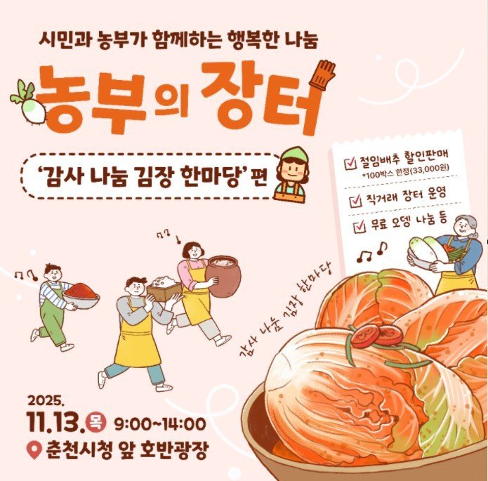 춘천지역 농가들이 시민들의 성원에 보답하고자 김장철을 맞아 특별한 직거래 장터와 김장 나눔 행사를 연다.‘춘천시 농부의 장터 – 감사 나눔 김장 한마당’이 13일 춘천시청 광장에서 열린다. 오전 9시부터 오후 2시까지 진행되는 이번 행사는 지역 농가들이 자발적으로 마련했다.이번 행사는 올 한 해 동안 직거래 장터를 통해 시민들에게 받은 사랑에 보답하고자 기획됐다. 농가들은 직접 생산한 참깨, 들깨, 꿀, 토마토, 절임배추 등을 판매하는 직거래 장터 부스를 운영한다. 또한, 직접 담근 김장김치 200박스를 지역 복지시설 7곳에 전달하며 따뜻한 마음을 나눌 예정이다.장터를 찾는 시민들을 위한 감사 이벤트도 준비되어 있다. 1만원 이상 구매하는 고객에게는 곰탕 1팩을, 2만원 이상 구매하는 고객에게는 소양강쌀을 증정한다. 먹거리존도 운영하여 방문객들에게 다양한 즐거움을 선사할 계획이다.춘천시 농부의 장터는 올해 시민들의 큰 호응 속에 지역 농가의 판로를 확대하고, 로컬푸드 소비 문화를 확산하는 데 기여했다. 특히 아파트 단지를 중심으로 총 7회 개최되어 누적 매출 1억 원을 돌파하는 성과를 거두었다.춘천시는 앞으로도 농부의 장터를 지속적으로 확대 운영할 계획이다. 이성휘 농산물유통과장은 “내년에는 시민들이 언제든 지역 농산물을 만날 수 있는 상설 농부의 장터 운영을 본격적으로 추진하여 지속 가능한 지역 먹거리 순환 구조를 구축하겠다”고 밝혔다. -