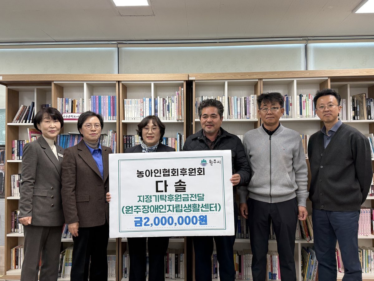 농아인협회 후원단체인 다솔이 지난 10일 원주장애인자립생활센터에 지정기탁 후원금 200만원을 전달하며 따뜻한 나눔을 실천했다.다솔의 이번 후원은 지역사회의 어려운 이웃들에게 희망을 전달하고 더불어 함께 성장하는 공동체를 만들어가는 데 기여하고자 마련됐다.다솔은 2018년부터 농아인협회 회원 등 취약계층을 위한 정기적인 후원과 지원을 꾸준히 이어오고 있다.이러한 지속적인 나눔 활동은 지역사회에 긍정적인 영향을 미치고 있다.다솔 관계자는 “어려움을 겪는 시기일수록 도움이 필요한 분들에게 작은 힘이라도 보태고 싶다”며 지속적인 나눔 활동을 약속했다.또한 “이웃과 함께 성장하는 건강한 지역공동체 조성을 위해 노력하겠다”고 밝혔다.신승희 원주시 복지국장은 다솔의 따뜻한 마음에 감사를 표하며 “꾸준한 관심과 배려가 지역 주민들에게 큰 희망이 될 것”이라고 말했다.