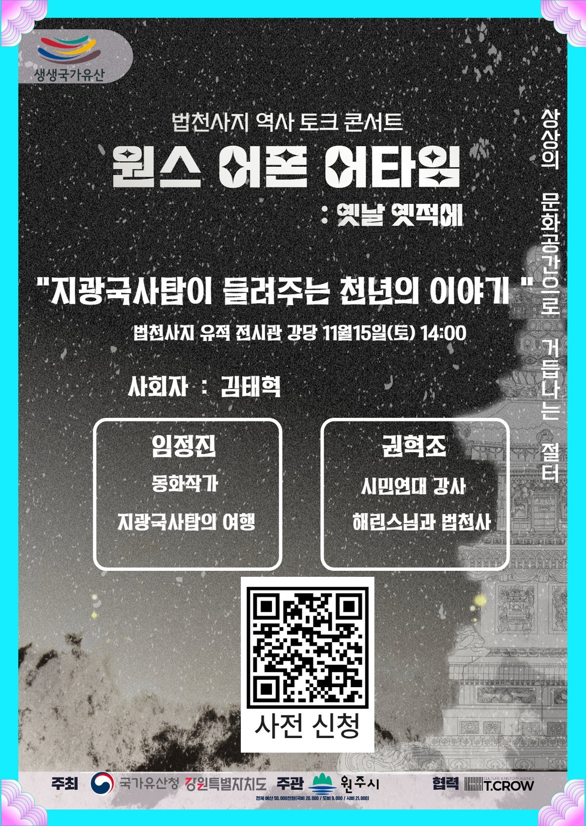 원주시역사박물관은 오는 15일 오후 2시, 법천사지 유적전시관에서 ‘법천사지 역사 토크 콘서트’를 개최한다.박물관은 국가유산청의 ‘생생 국가유산 사업’공모에 선정돼, 지역 국가유산인 법천사지·거돈사지·법천사지 지광국사탑·법천사지 지광국사탑비·거돈사지 삼층석탑·거돈사지 원공국사탑비 등을 활용한 다양한 프로그램을 운영하고 있다.이 사업의 일환으로 11월 15일 열리는 이번 토크 콘서트에서는 시민연대 강사, 동화 작가, 지역 주민, 참여자들이 모여 법천사지의 역사·문화에 대해 알아보고 토의하는 시간을 가질 예정이다.사전 예약은 시 홈페이지 등에 게시된 안내문의 큐알코드를 통해 신청할 수 있다.김영언 박물관장은 “원주의 대표적인 폐사지 법천사지에서 펼쳐지는 역사 토크 콘서트를 통해 많은 사람이 대표적인 국가유산인 법천사지에 대해 알게 되는 계기가 되길 기대한다”고 말했다. -