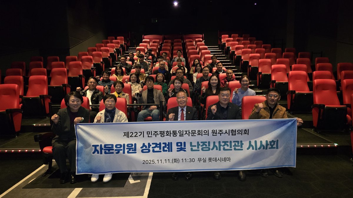 민주평화통일자문회의 원주시협의회가 지난 11일, 제22기 자문위원 상견례를 개최하고 영화 '난징사진관' 시사회를 진행했다.이번 행사는 새롭게 위촉된 자문위원들이 처음으로 한자리에 모여 서로 인사를 나누고, 향후 2년간 평화와 통일을 위한 공동의 노력을 다짐하는 자리로 마련됐다.상견례에 참석한 위원들은 '난징사진관'을 함께 관람하며 전쟁의 참혹함을 마주했다. 이를 통해 평화의 소중함과 인권 존중의 중요성을 다시 한번 깨닫는 시간을 가졌다.김금주 회장은 “새롭게 위촉된 자문위원들이 지역사회에서 평화와 통일의 가치를 널리 알리고, 시민들과 함께 평화 공감 활동을 활발히 펼쳐나가기를 기대한다”고 밝혔다.이어 “이번 상견례와 시사회를 시작으로 민주평통 원주시협의회는 앞으로도 평화통일을 위한 노력에 더욱 힘쓸 것”이라고 덧붙였다. -