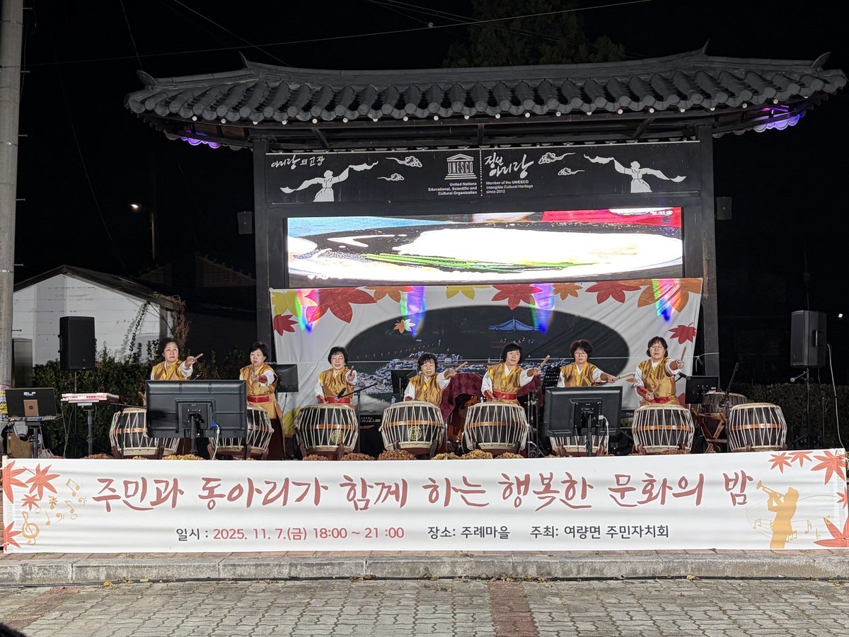 여량면 주민자치회는 7일 오후 6시, 여량면 주례마을 광장에서 ‘주민과 함께하는 동아리 문화공연 행사’를 개최했다.이번 행사는 지역 동아리 활동을 활성화하고 주민이 함께 어울릴 수 있는 문화 교류의 장을 마련하기 위해 추진된 것으로 여량면 주민으로 구성된 지역동아리 6개 팀이 참여해 다채로운 공연을 선보였다.공연에는 모듬북, 기타, 색소폰, 밴드, 실버노래교실 등 다양한 장르의 팀이 출연해 풍성한 볼거리를 제공했으며 주민들은 공연을 즐기며 가을밤의 정취와 따뜻한 지역공동체의 분위기를 만끽했다.장택상 여량면 주민자치회장은 “이번 행사를 통해 지역 동아리들이 재능을 마음껏 발휘하고 주민이 함께 즐길 수 있는 뜻깊은 시간을 마련하게 되어 기쁘다”며“앞으로도 지역문화예술 활성화와 공동체 역량 강화를 위해 지속적으로 노력하겠다”고 밝혔다. -