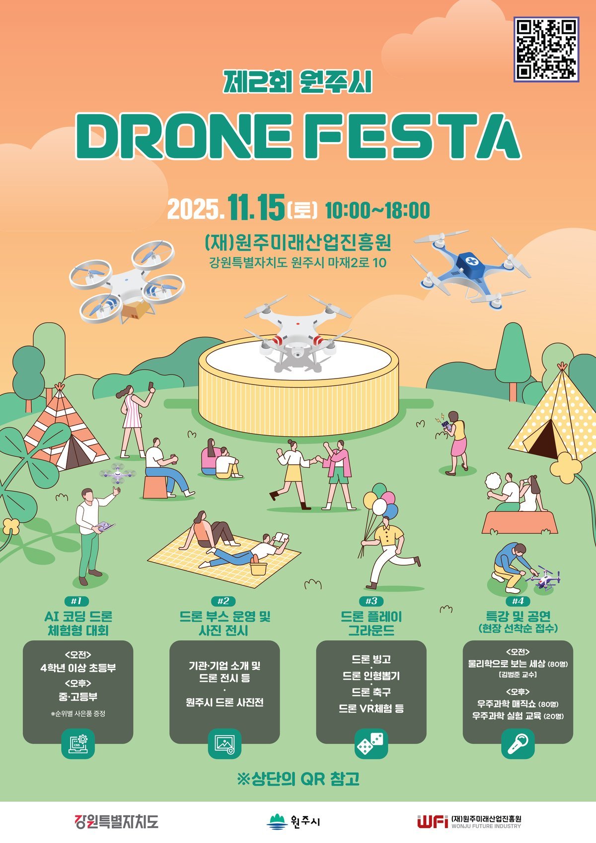 원주시가 11월 15일 원주미래산업진흥원에서 '제2회 원주시 드론페스타'를 개최하며 시민들에게 드론과 첨단 기술을 직접 체험할 기회를 제공한다.이번 행사는 AI 코딩 드론 체험, 드론 사진전, 드론 플레이그라운드 등 다양한 프로그램으로 구성되어 드론에 대한 시민들의 접근성을 높이는 데 초점을 맞췄다.특히 원주시 교육발전특구 사업과 연계해 첨단 기술 관련 특강과 교육, 체험 프로그램을 운영, 학생들이 미래 산업 기술을 이해하고 진로를 탐색하는 데 도움을 줄 예정이다.주요 프로그램인 AI 코딩 드론 체험형 대회는 초등부와 중·고등부로 나뉘어 진행되며 참가자들은 코딩 실습 후 테마별 주행 미션을 수행하게 된다.이 외에도 드론 축구, 드론 빙고 드론 인형 뽑기 등 다채로운 드론 체험 활동이 준비되어 있다.첨단 기술 분야에서는 '물리학으로 보는 세상', '뉴트의 초록우주를 찾아서'등의 특강과 우주과학 실험, 3D 및 가상현실 기술을 활용한 교육 프로그램이 진행된다. -