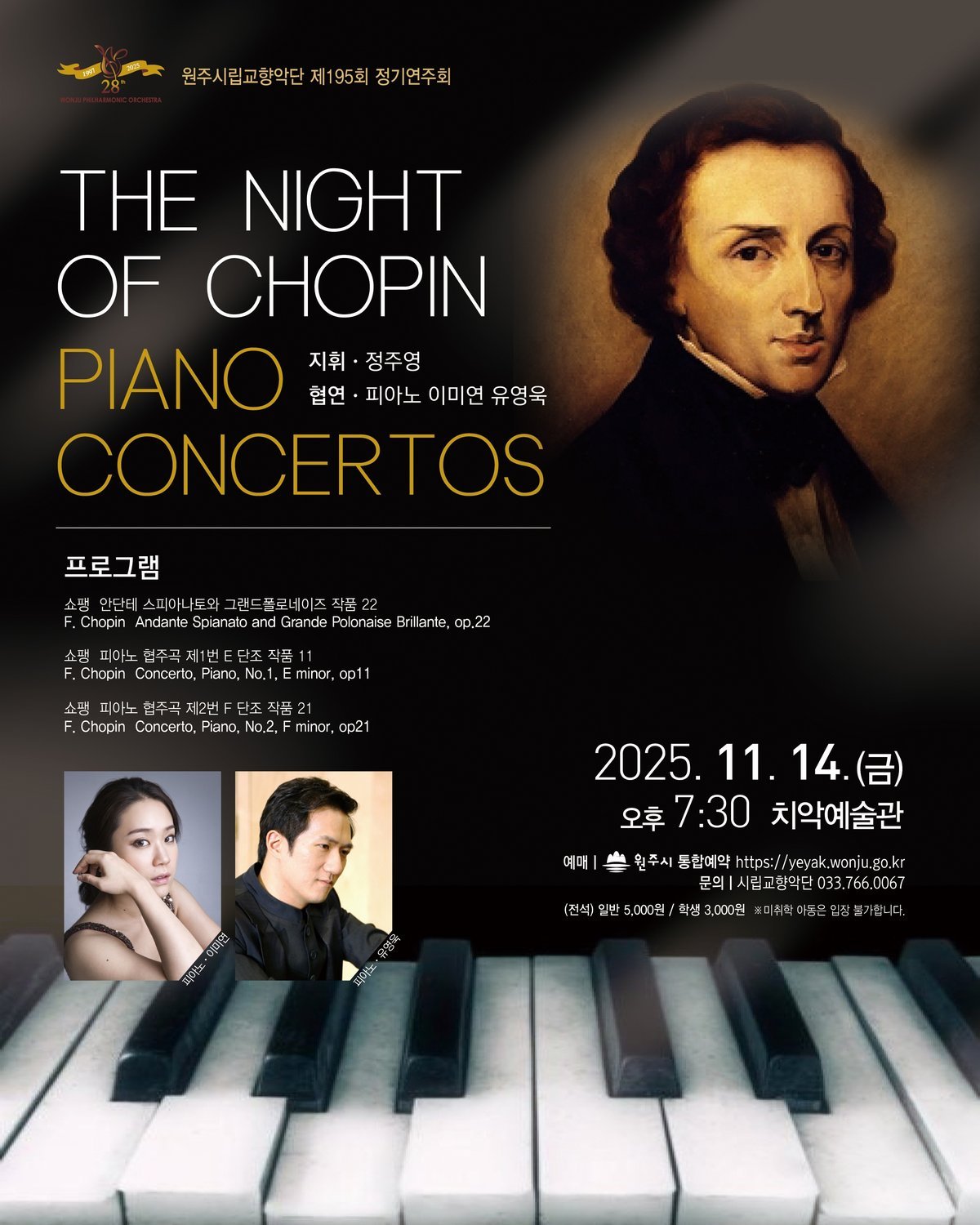 원주시립교향악단이 오는 14일 치악예술관에서 제195회 정기연주회 'The Night of CHOPIN'을 개최한다.이번 공연은 쇼팽의 아름다운 선율을 감상할 수 있는 특별한 기회로 피아니스트 이미연과 유영욱이 협연해 쇼팽 피아노 협주곡 1번과 2번을 선보일 예정이다.쇼팽 피아노 협주곡 1번은 1830년에 작곡됐으며, 피아노의 섬세하고 감동적인 선율이 특징이다.관현악과의 조화 속에서 피아노의 역할이 더욱 돋보이는 곡으로 평가받는다.피아노 협주곡 2번은 고전적인 협주곡 구조를 따르면서도 폴란드 마주르카 스타일의 리듬을 담아낸 3악장 구성이다.이번 연주회에는 뛰어난 실력과 음악성을 인정받는 두 명의 피아니스트가 함께한다.이미연은 한국예술종합학교와 베를린예술대학교를 졸업하고 예술의전당 토요콘서트와 아티스트 라운지에서 해설과 연주를 맡은 바 있다.유영욱은 '한국의 베토벤'이라는 별칭으로 불릴 만큼 세계적으로 인정받는 피아니스트다.원주시립교향악단은 쇼팽의 음악을 사랑하는 이들에게 잊지 못할 감동을 선사할 것으로 기대된다.예매는 원주시 통합예약플랫폼에서 가능하며 자세한 사항은 원주시립교향악단에 문의하면 된다. -