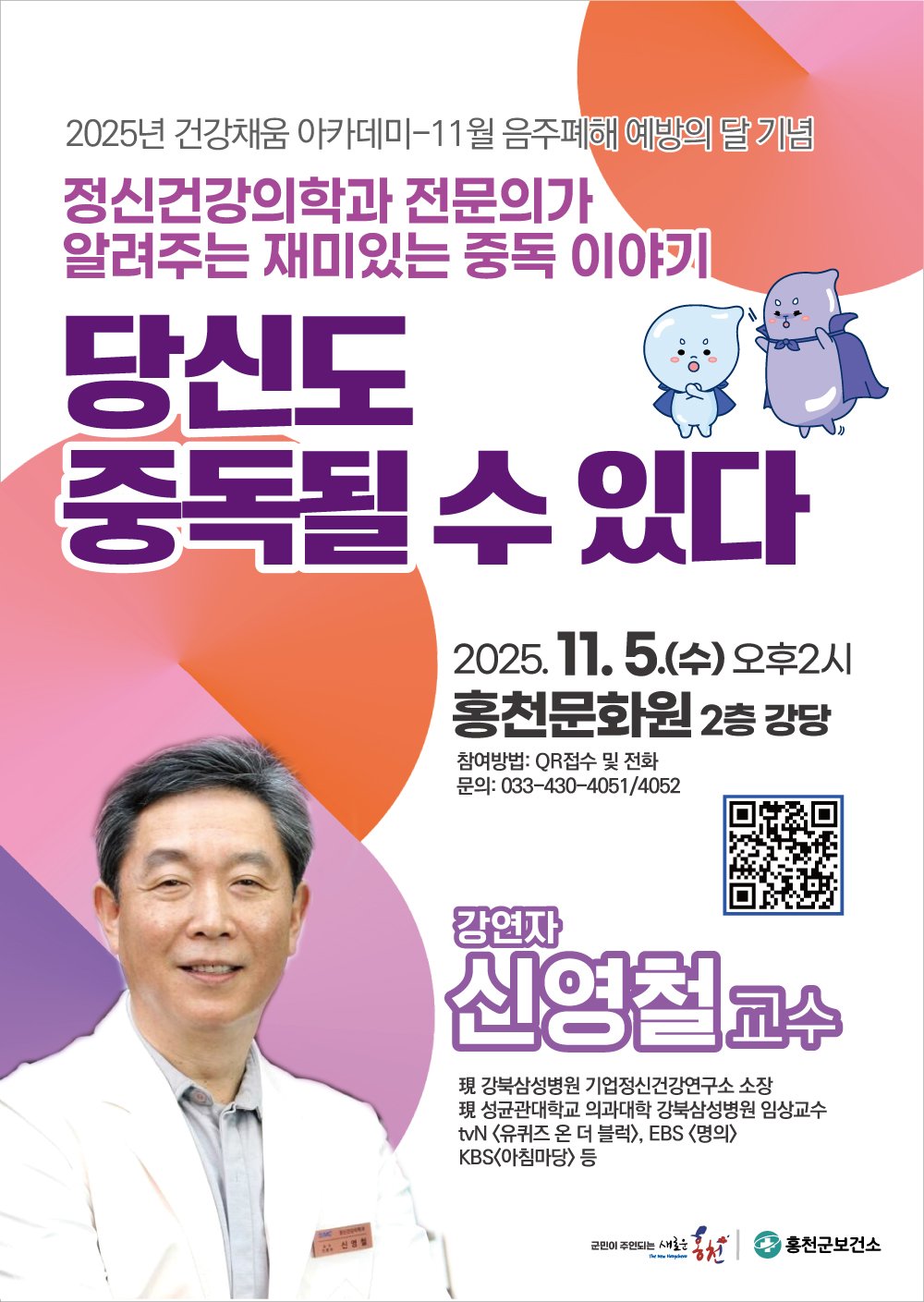 홍천군이 11월 '음주 폐해 예방의 달'을 맞아 주민들의 건강한 생활 습관 형성을 돕기 위해 나선다.오는 11월 5일 홍천문화원에서 '2025년 건강채움 아카데미 - 중독 예방을 위한 강연'을 개최하여, 음주 폐해의 심각성을 알리고 건강한 절주 습관을 장려할 계획이다.이번 아카데미는 과도한 음주가 신체와 정신에 미치는 악영향을 알리고, 나아가 마약, 도박, 게임 등 다양한 중독 문제에 대한 올바른 인식을 심어주기 위해 마련되었다.강연은 정신건강의학과 전문의인 신영철 교수가 맡아 진행한다. 신 교수는 강북삼성병원 기업정신건강연구소장이자 성균관대학교 의과대학 강북삼성병원 임상교수로 재직 중이며, '유 퀴즈 온 더 블록', '명의', '아침마당' 등 다양한 방송 프로그램에 출연하며 전문성을 인정받은 바 있다.이번 강연은 홍천군민 누구나 무료로 참여할 수 있으며, 선착순 200명까지 신청을 받는다. 참여를 원하는 주민은 11월 4일까지 QR코드를 스캔하거나 전화로 신청하면 된다.홍천군보건소 원은숙 소장은 “이번 강연을 통해 지역 주민들이 올바른 음주 습관과 절주 수칙을 익히고, 음주뿐 아니라 다양한 중독 문제에 대한 인식을 높여 건강하고 행복한 홍천을 만들어가기를 기대한다”고 밝혔다. -