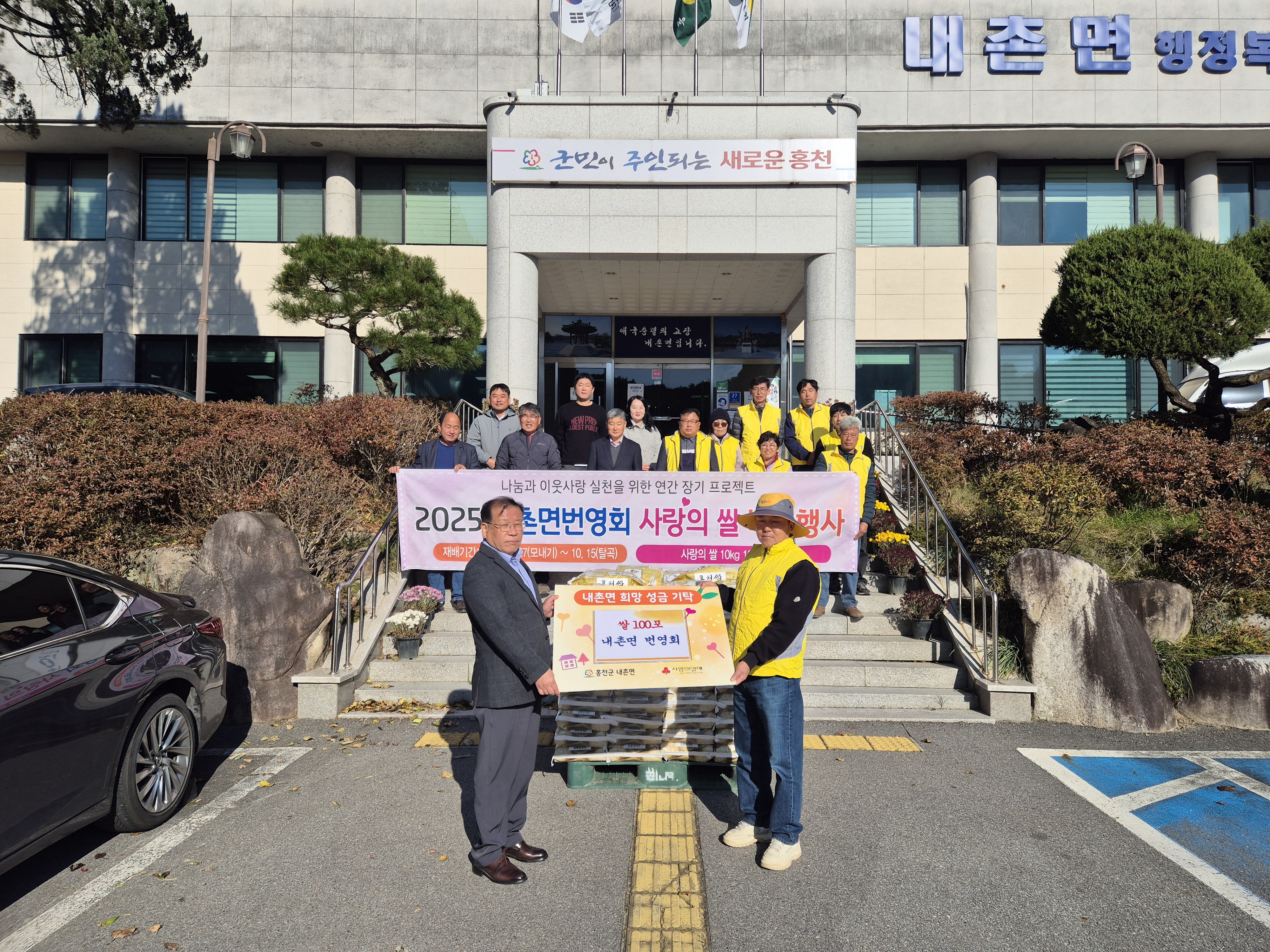 홍천군 내촌면 번영회가 지난 3일, 직접 수확한 쌀 10kg 100포를 내촌면행정복지센터에 기탁하며 따뜻한 나눔을 실천했다. 기탁된 쌀은 400만원 상당으로, 지역 내 어려운 이웃들에게 전달될 예정이다.이번 쌀 기탁은 내촌면 번영회 회원들이 지난 5월 모내기부터 10월 수확까지, 수개월 동안 정성껏 가꾼 결실이다. 특히 화상대리에 거주하는 박재원 씨는 자신의 토지 3,000㎡를 기부 논으로 제공하며 이웃돕기에 힘을 보탰다.이왕재 내촌면 번영회장은 “회원들이 함께 마음을 모아 수확한 쌀이 관내 저소득 가정과 취약계층에 조금이나마 도움이 되기를 바란다”고 소감을 밝혔다.조정순 내촌면장은 번영회의 따뜻한 나눔에 감사를 표하며, 기탁된 쌀이 필요한 가정에 잘 전달될 수 있도록 하겠다고 약속했다. 내촌면 번영회는 앞으로도 지속적인 나눔 활동을 통해 지역사회에 공헌할 계획이다.이번 쌀 기탁은 단순한 물품 전달을 넘어, 지역 주민들의 따뜻한 마음과 협력이 만들어낸 의미 있는 결실로 평가받고 있다. 내촌면 번영회의 꾸준한 이웃사랑 실천이 지역사회에 훈훈한 감동을 전하고 있다. -
