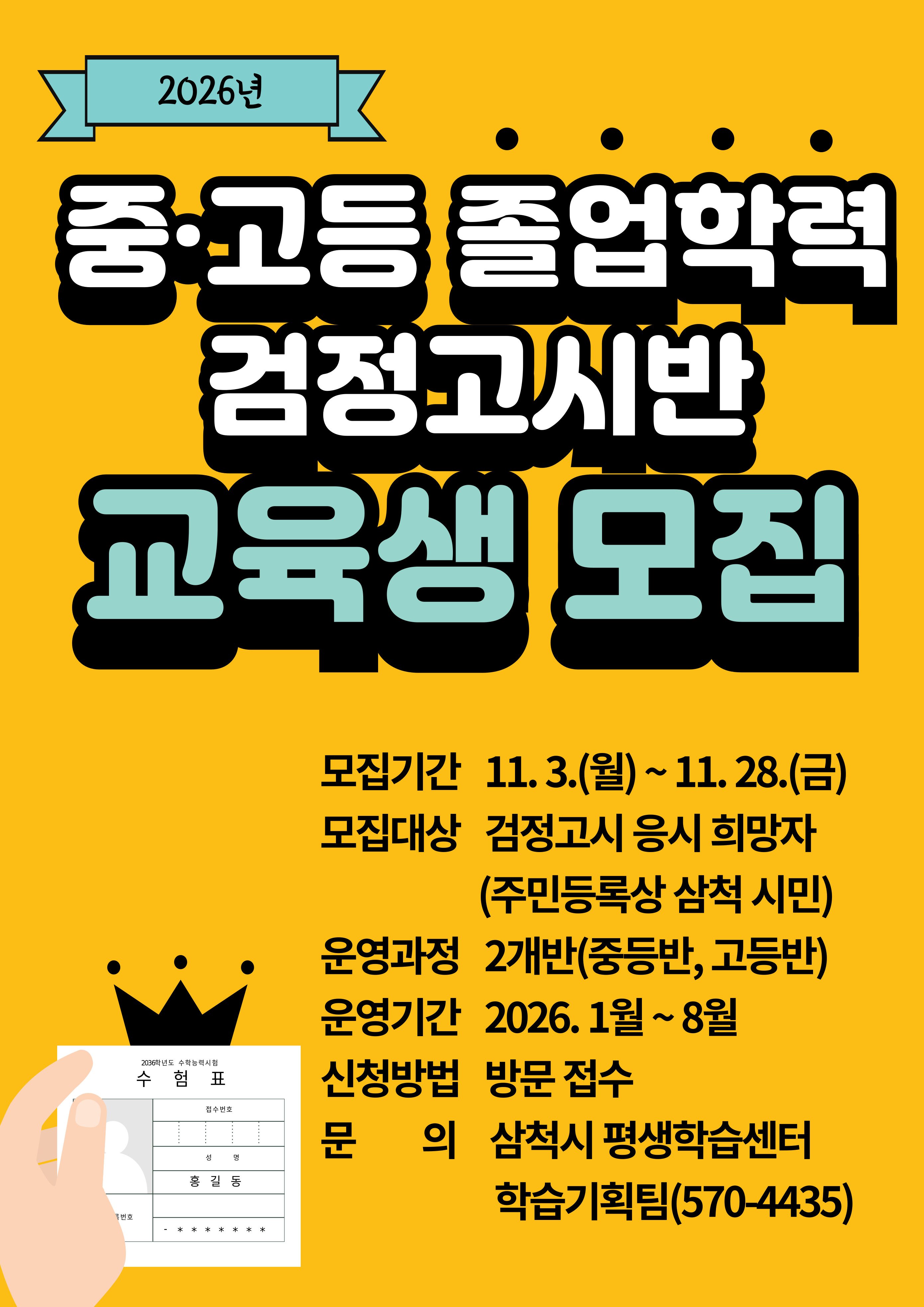 삼척시, 2026년 검정고시반 운영…학력 취득 기회 넓힌다