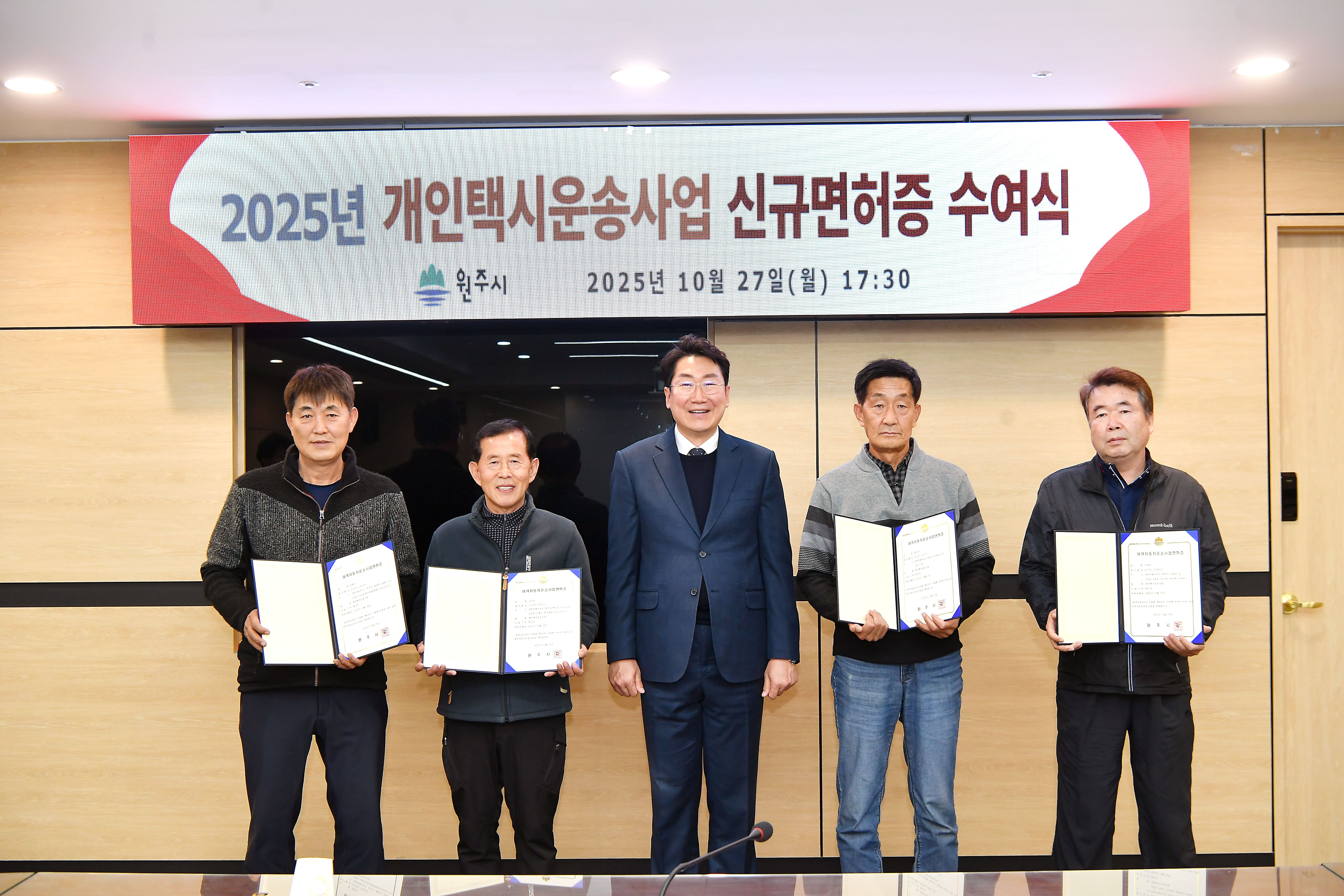 원주시가 2025년 개인택시운송사업 신규 면허 대상자 4명을 확정하고, 시청에서 면허증 수여식을 개최하며 오랜 기다림에 종지부를 찍었다.이번 수여식은 지난 8월 신규 면허 모집 공고를 통해 접수된 13명 중 엄격한 심사를 거쳐 선발된 4명에게 개인택시 운전의 기회를 제공하기 위해 마련됐다.원주시는 20년 넘게 개인택시 면허를 기다려온 시민들의 염원을 담아 이번 신규 면허를 추진했으며, 공정한 심사를 통해 대상자를 선정했다.원강수 원주시장은 수여식에서 "오랜 기다림 끝에 개인택시 면허를 받게 된 모든 분께 존경과 축하를 전한다"며, "시민들에게 안전하고 친절한 교통 서비스를 제공해 줄 것을 기대한다"고 당부했다.이번 신규 면허 발급은 원주시 택시 서비스의 질을 향상시키고, 시민들의 교통 편의를 증진하는 데 기여할 것으로 전망된다. 원주시는 앞으로도 시민 중심의 교통 정책을 추진해 나갈 계획이다. -