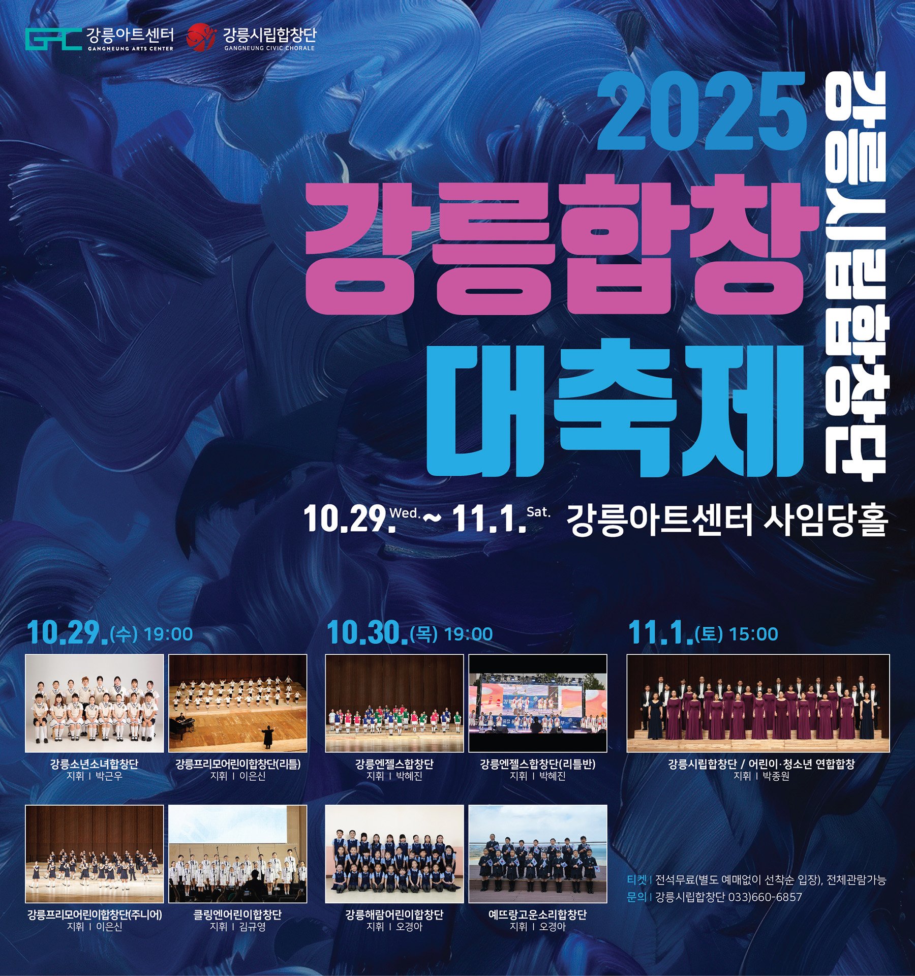 강릉시가 2025년 10월 29일부터 11월 1일까지 강릉아트센터 사임당홀에서 '2025 강릉합창대축제'를 개최한다.강릉시립합창단과 지역 내 어린이 및 청소년 합창단 8팀이 참여하는 이번 축제는, 청소년 음악 인재들에게 꿈을 펼칠 기회를 제공하고 세대 간의 음악적 교류를 활성화하기 위해 기획됐다.이번 공연에서는 '무지개 빛 하모니', '버터플라이' 등 다채로운 레퍼토리가 어린이와 청소년 합창단의 맑고 청아한 목소리로 선보일 예정이다. 특히, 마지막 날에는 강릉시립합창단과 모든 참가 합창단이 함께 연합 합창을 선보이며 대단원의 막을 내린다.김홍규 강릉시장은 "이번 합창대축제가 어린이와 청소년들이 꿈과 희망을 키우는 소중한 경험이 되기를 바란다"며, "앞으로도 미래 인재들이 잠재력을 발휘할 수 있도록 적극적인 지원을 아끼지 않겠다"고 밝혔다.이번 축제는 강릉 시민들에게 아름다운 음악을 통해 감동과 즐거움을 선사하고, 지역 사회의 문화 예술 발전에 기여할 것으로 기대된다. -