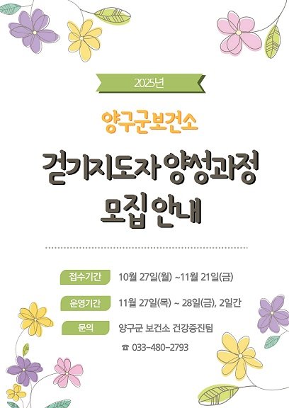 양구군이 군민들의 건강한 생활 습관을 장려하고 걷기 문화를 확산하기 위해 '2025년 걷기 지도자 양성 과정'을 운영한다.이번 교육은 11월 27일부터 28일까지 양일간 양구군보건소에서 진행되며, 걷기 지도자 2급 자격 취득을 위한 이론 및 실습 교육으로 구성된다. 교육 시간은 오전 9시부터 오후 6시까지, 하루 8시간씩 총 16시간이다.양구군은 11월 21일까지 걷기 지도자 양성 과정 참가자를 모집한다. 양구군민이라면 누구나 신청 가능하며, 선착순으로 30명을 선발한다. 신청은 방문 또는 이메일을 통해 할 수 있다.교육 참가비는 무료다. 다만, 자격증 발급을 원하는 경우 발급 비용 5만 원은 본인이 부담해야 한다. 교육 참가자는 편안한 복장과 운동화를 착용해야 하며, 점심 식사는 개별적으로 준비해야 한다.양구군보건소는 이번 양성 과정을 통해 지역 내 걷기 동아리 지도자와 건강 생활 실천 리더를 육성하여 군민들이 스스로 건강을 관리할 수 있는 환경을 조성할 계획이다. 걷기 문화 확산에 관심 있는 군민들의 적극적인 참여를 기대하고 있다. -