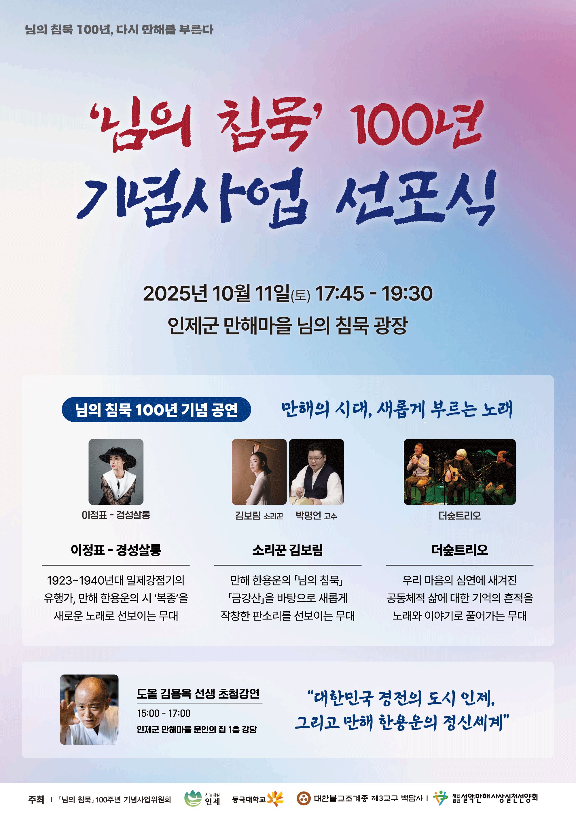만해 한용운 선사의 대표 시집인 '님의 침묵' 발간 100주년을 기념하는 대규모 사업이 본격적인 시작을 알렸다. 인제군과 동국대학교가 공동으로 추진하고 기념사업위원회가 주관하는 선포식이 오는 10월 11일 오후 3시 만해마을에서 열린다. '님의 침묵'은 1925년 8월 내설악 백담사에서 탈고되어 이듬해인 1926년 출간된 불멸의 작품이다. 이 시집은 만해의 독립운동 정신과 깊은 사상을 담고 있어 한국 문학사에 큰 획을 그었다. 이번 행사는 2026년으로 예정된 실제 발간 100주년 기념행사에 앞서 사업의 시작을 대외적으로 선포하는 자리다. 기념사업위원회는 이번 프로젝트를 통해 지난 30년간 이어져 온 만해축전의 틀을 넘어, '만해 사상과 정신의 현대적 계승'이라는 목표를 명확히 했다. 이는 만해의 정신을 지역성과 연계하여 대중에게 더욱 친숙하게 전달하고, 그의 사상을 21세기적 관점에서 재해석하겠다는 대대적인 변화를 염두에 둔 것이다. 선포식과 함께 다채로운 부대 행사도 마련된다. 특히 저명한 석학인 도올 김용옥 선생을 초청해 특별 강연을 진행하며, '만해의 시대, 새롭게 부르는 노래'라는 주제로 기념 공연도 펼쳐진다. 주최 측은 이번 기념사업이 만해의 정신을 재조명하고 그의 문학적 가치를 현대 사회에 확산하는 중요한 전환점이 될 것으로 기대하고 있다. -