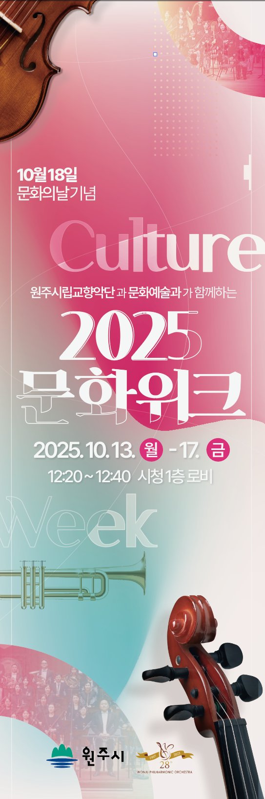 원주시가 시민들의 문화 향유 기회를 확대하기 위해 시립교향악단과 함께 특별한 '런치 콘서트'를 마련했다. 10월 18일 문화의 날을 기념해 기획된 '2025 문화위크'는 10월 13일부터 17일까지 5일간 원주시청 1층 로비에서 매일 낮 12시 20분부터 20분간 진행된다.이번 문화위크는 시립교향악단 단원들이 직접 파트별 유닛을 구성하고 프로그램을 기획해 재능기부 형태로 참여한다는 점에서 의미가 크다. 시민들은 점심시간을 활용해 일상 속에서 수준 높은 클래식 공연을 무료로 접할 수 있게 됐다.5일간 매일 다른 악기 구성의 앙상블이 다채로운 무대를 선보인다. 첫날인 13일에는 헨델의 호른 4중주를 시작으로, 14일에는 현악 6중주가 이어진다.주중 중간인 15일에는 목관 5중주와 바이올린 4중주가 동시에 펼쳐지며 풍성함을 더한다. 이후 16일에는 현악 4중주, 마지막 날인 17일에는 금관 5중주가 대미를 장식하며 친숙하면서도 깊이 있는 클래식의 매력을 전달할 예정이다.원주시 문화예술과 관계자는 “이번 행사가 시민들이 예술인들의 열정에 공감하고 아름다운 선율을 통해 예술을 가까이하는 시간이 되기를 기대한다”고 밝혔다. 시는 이번 문화위크를 통해 시민들의 문화적 갈증을 해소하고 지역 예술인과의 교류를 활성화할 수 있을 것으로 전망한다. -