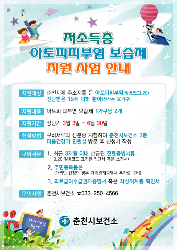 춘천시가 저소득층 아토피 환아들에게 선착순으로 아토피 보습제를 지원한다. 지원 대상은 의료수급권자와 차상위계층 등 취약계층 아토피 환아들이다. 신청자는 진단서 및 의료수급권자/차상위계층 증명서를...