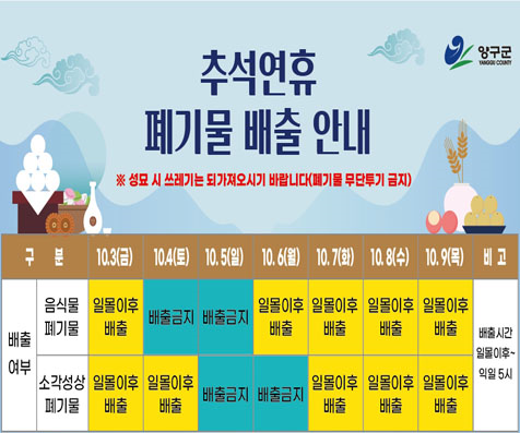 추석 연휴 쓰레기 배출 일자 확인하세요