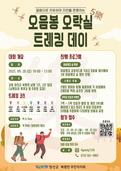 정선 북평면주민자치회는 오는 9월 20일 지역주민과 관광객이 함께 어울릴 수 있는 두 가지 특별한 행사를 마련해 문화와 건강을 동시에 즐길 수 있는 하루를 선사한다. 20일 북평면 오전 10시부터 남평리 일원에서 ‘2025 오음봉 오락실 트레킹 데이’ 가 진행된다. 북평면 주민자치회가 주관하는 이번 행사에는 약 200여명의 주민과 사전 참가 신청자가 참여해 맨발 황토길, 백일홍·수국 꽃길, 황금벼 논두렁길, 오음봉 숲길, 마음길 등 총 4.7km 구간을 함께 걸으며 가을 정취를 만끽한다. 걷기 행사에 앞서 개회식과 간단한 이벤트, 기념품 배부가 준비돼 있으며 남녀노소 누구나 참여할 수 있는 가족 친화형 행사로 진행된다. 같은 날 오후 6시에는 북평면 북평7길 옛 시장 골목에서 지역 주민이 직접 준비한 나전역 야시장 ‘야밤바’ 가 개장한다. 오후 9시까지 열리는 야시장에는 주민 셀러 20팀이 참여해 다양한 음식을 선보이며 관내 버스커와 동아리 공연이 골목을 풍성하게 채운다. 방문객을 위한 SNS 리뷰 이벤트, 현장 상품권 이벤트 등도 마련돼 있어 젊은 층부터 가족 단위 관광객까지 즐길 수 있다. 이번 행사는 주민자치회가 주도적으로 기획·운영해 주민 참여와 공동체 의식을 높이는 것은 물론, 침체된 지역 상권을 활성화하는 데 큰 의미가 있다. 트레킹 대회를 통해 지역의 자연환경과 마을 자원을 널리 알리고 야시장을 통해 소규모 창업과 주민 소득 증대의 기회를 제공함으로써 북평면 발전의 새로운 활력을 불어넣을 것으로 기대된다. 정현인 북평면주민자치회장은 “이번 두 행사는 주민 주도로 기획된 만큼 지역 상권 활성화와 공동체 네트워크 강화에 큰 의미가 있다”며 “주민과 방문객 모두가 함께 즐기며 정선의 매력을 체험할 수 있는 기회가 되길 기대한다”고 밝혔다. -