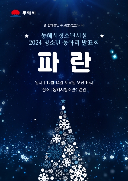 동해시는 오는 12월 14일에 동해시청소년수련관에서 2024년도 동해시청소년동아리 발표회 ‘파란’을 개최한다고 밝혔다. 2024년 청소년동아리 발표회 ‘파란’은 한 해를 돌아보며 동아리 활동을 마무리 짓고 청소...