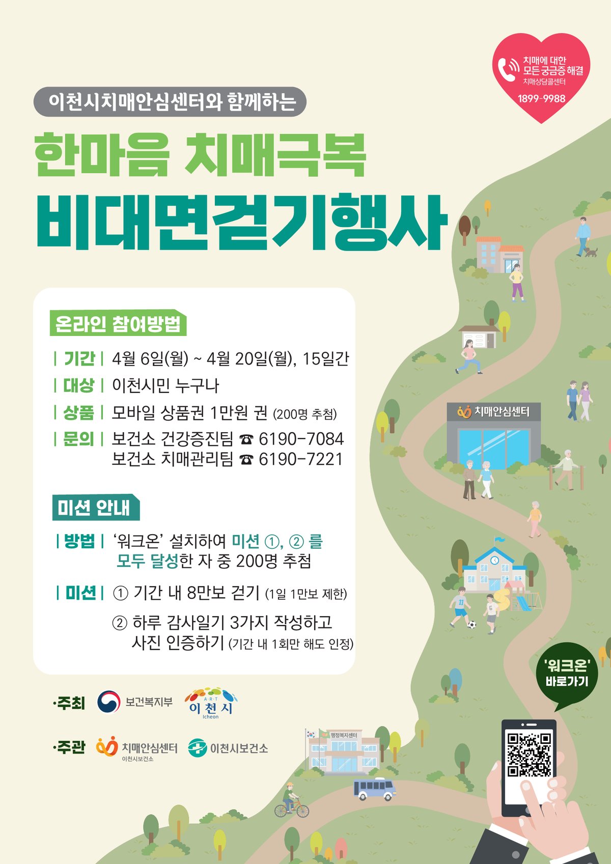 참여 방법은 간단하다. 먼저 휴대전화에 '워크온' 앱을 설치해야 한다. 그 후 이천시 공식 커뮤니티 '온 이천 Walk'에 가입, '4월 한마음 치매극복 건강 걷기 챌린지'를 신청하면 된다.