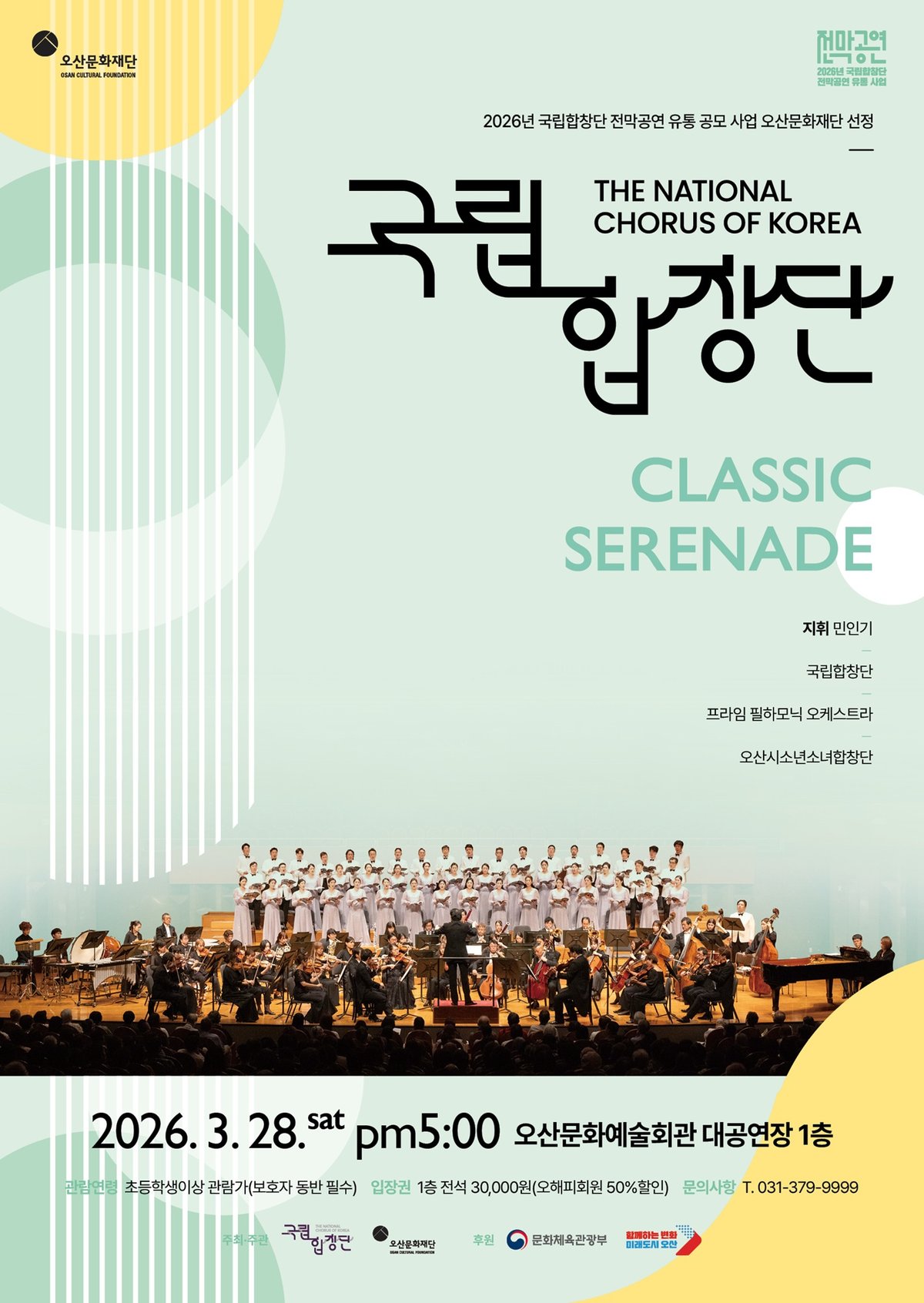 [PEDIEN] 국립합창단의 새로운 공연 'CLASSIC SERENADE'가 오는 28일 오후 5시, 오산문화예술회관 대공연장에서 전국 최초로 공개된다. 이번 공연은 오산문화재단이 국립합창단의 '2026 전막 공연 유통 공모사업'에 선정되면서 성사됐다.