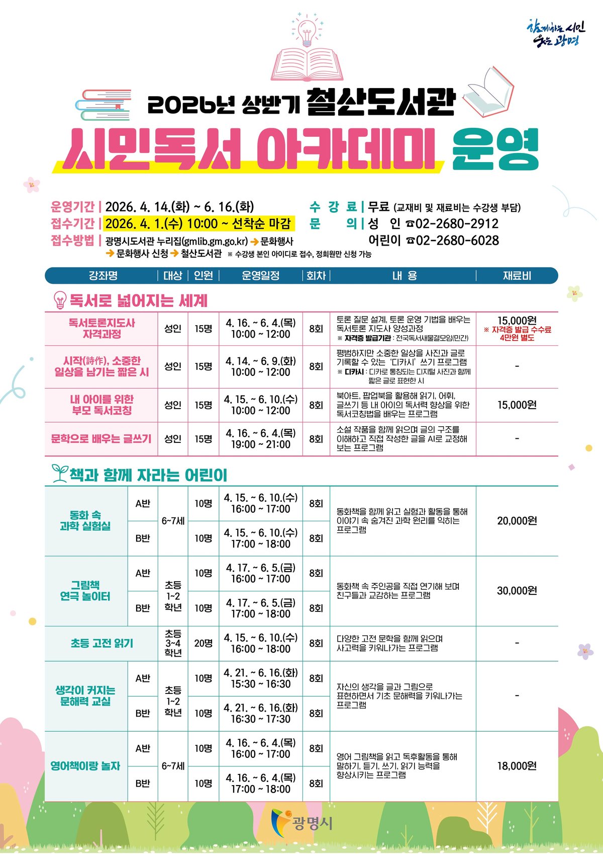 [PEDIEN] 광명시 철산도서관이 2026년 상반기 시민 독서 아카데미 수강생을 4월 1일부터 모집한다. 시민들의 인문학적 소양 함양과 능동적인 독서 문화 확산을 위해 기획된 프로그램이다.