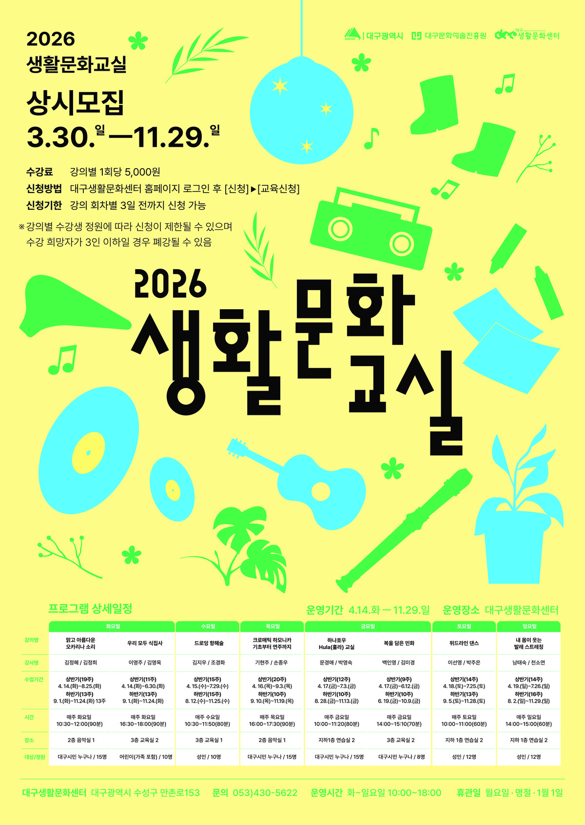 수강 신청은 3월 30일부터 대구생활문화센터 홈페이지에서 선착순으로 받는다. 프로그램은 4월부터 11월까지 진행되며, 수강료는 회차당 5000원이다. 일부 프로그램은 재료비가 추가될 수 있다.