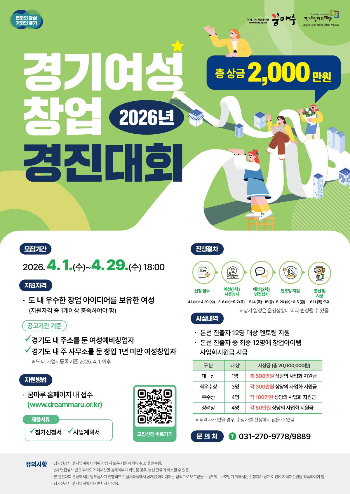 기타 자세한 사항은 여성창업플랫폼 꿈마루 누리집 또는 경기도일자리재단 기업지원팀으로 문의하면 된다.