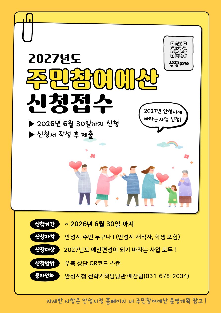 [PEDIEN] 안성시가 2027년 예산 편성에 시민들의 목소리를 담기 위해 주민참여예산 제안사업 공모를 시작한다. 6월 30일까지 안성 시민 누구나 참여 가능하다.