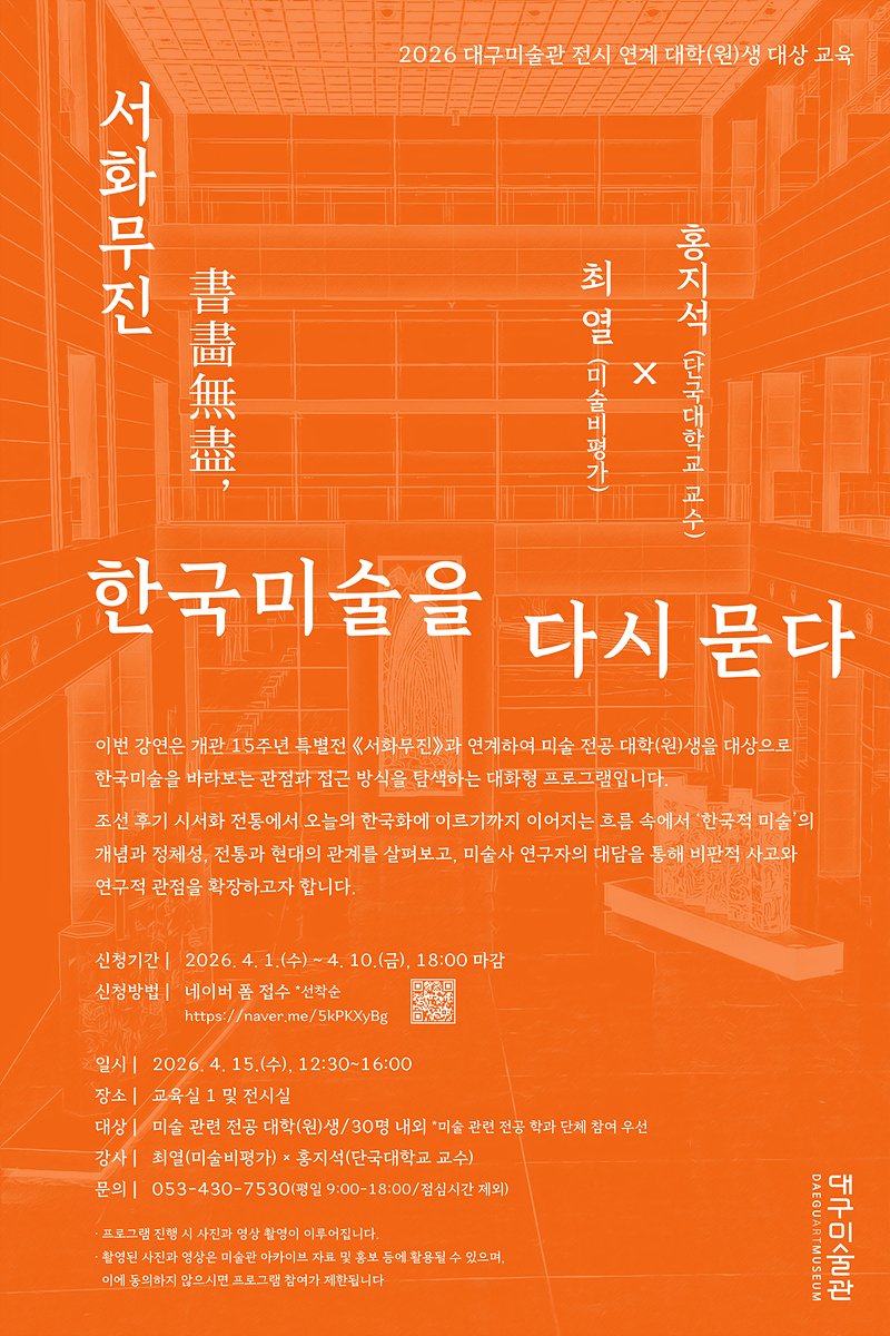 [PEDIEN] 대구미술관이 개관 15주년 특별전 '서화무진'과 연계하여 미술 전공 대학생을 대상으로 한 특별 교육 프로그램을 4월 15일에 개최한다.