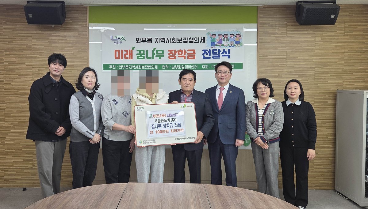 와부읍지역사회보장협의체는 지난 31일, 서울반도체가 기탁한 장학금을 지역 아동들에게 전달했다고 1일 밝혔다. 서울반도체는 지역 내 아동의 학업을 지원하고 교육 격차를 해소하기 위해 매월 100만원을 와부읍 지역사회보장협의체에 기탁해 왔다.