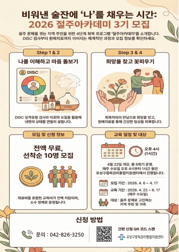 참여 신청은 6일부터 17일까지 유성구중독관리통합지원센터를 방문하거나, 안내 포스터 내 QR코드를 통해 가능하다. 참가 비용은 전액 무료이며, 선착순으로 10명을 모집한다. 서두르는 것이 좋다.