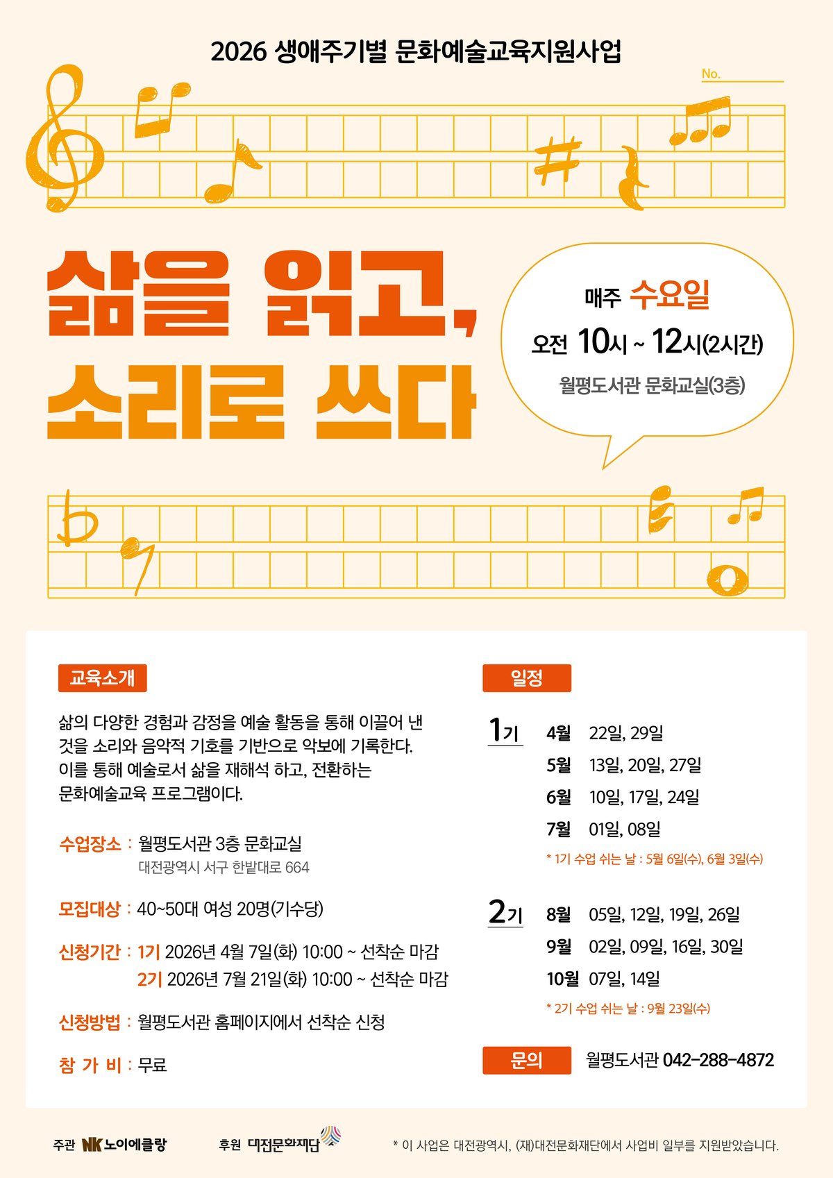 참가 신청은 월평도서관 홈페이지에서 가능하다. '삶을 읽고 소리로 쓰다'는 이달 7일 오전 10시부터, '선율과 문장'은 21일 오전 10시부터 선착순으로 모집한다.