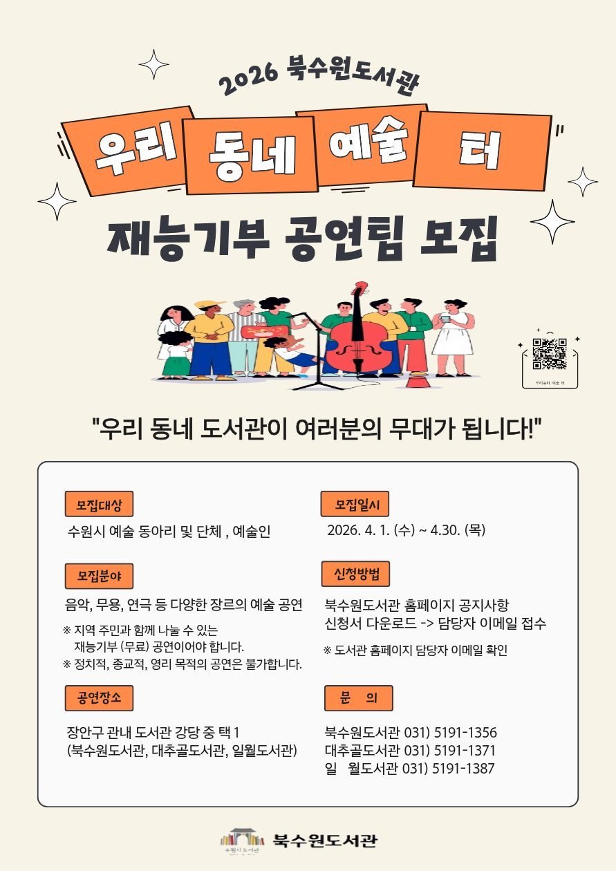 [PEDIEN] 북수원 대추골 일월도서관이 시민 참여 문화공연 '우리동네 예술 터'에 함께할 재능기부 공연팀을 모집한다. 4월 30일까지 접수하며, 선정된 팀에게는 도서관 무대에서 공연 기회가 주어진다.