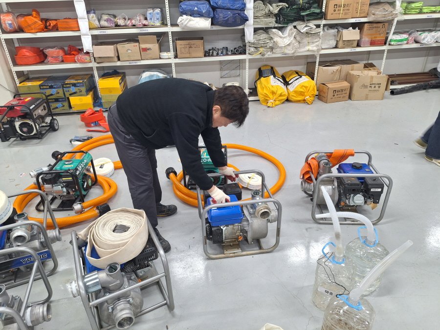 주요 점검 사항은 양수기와 수중펌프의 정상 작동 여부다. 모래주머니, 마대 등 응급 복구 자재의 비축 수량도 확인한다. 수방 자재 보관 창고의 관리 상태 역시 꼼꼼히 점검한다.