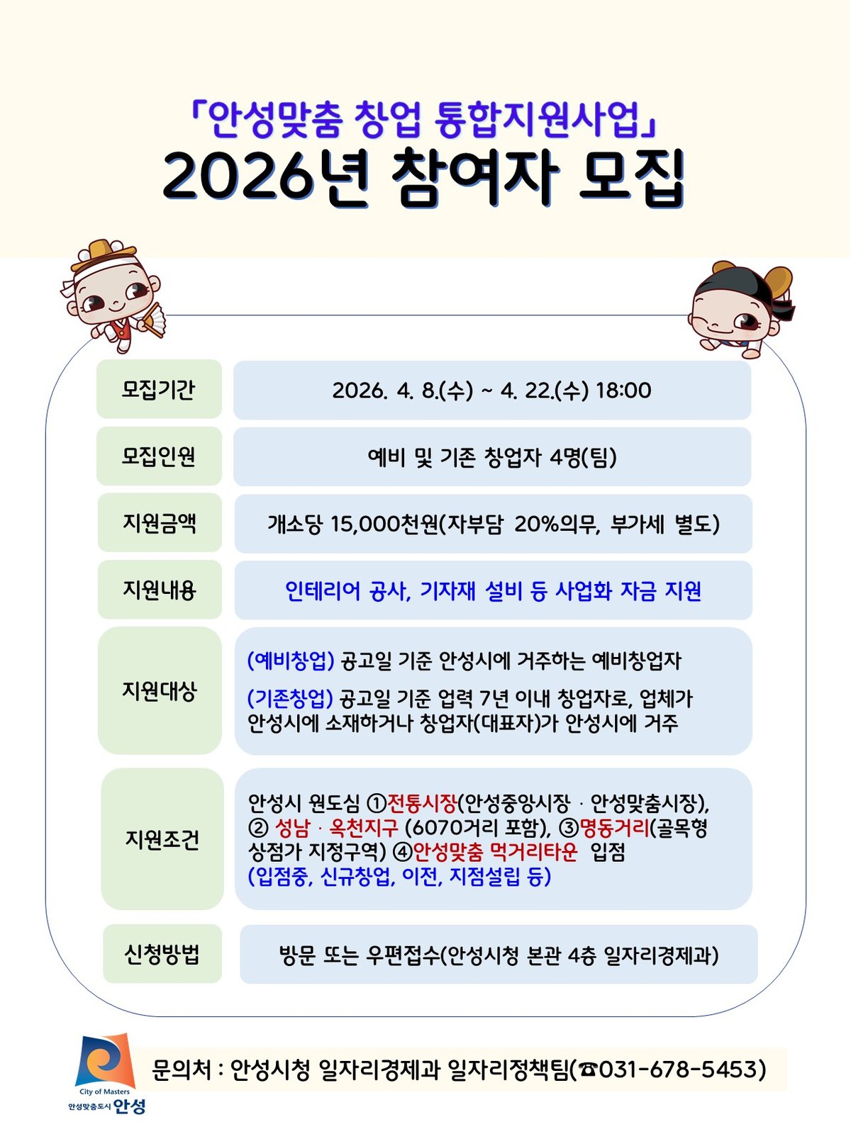 [PEDIEN] 안성시가 2026년 안성맞춤 창업 통합지원사업 참여자를 4월 8일부터 22일까지 모집한다. 이번 사업은 지역 상권 활성화와 차세대 문화 관광 자원 육성을 목표로 한다.