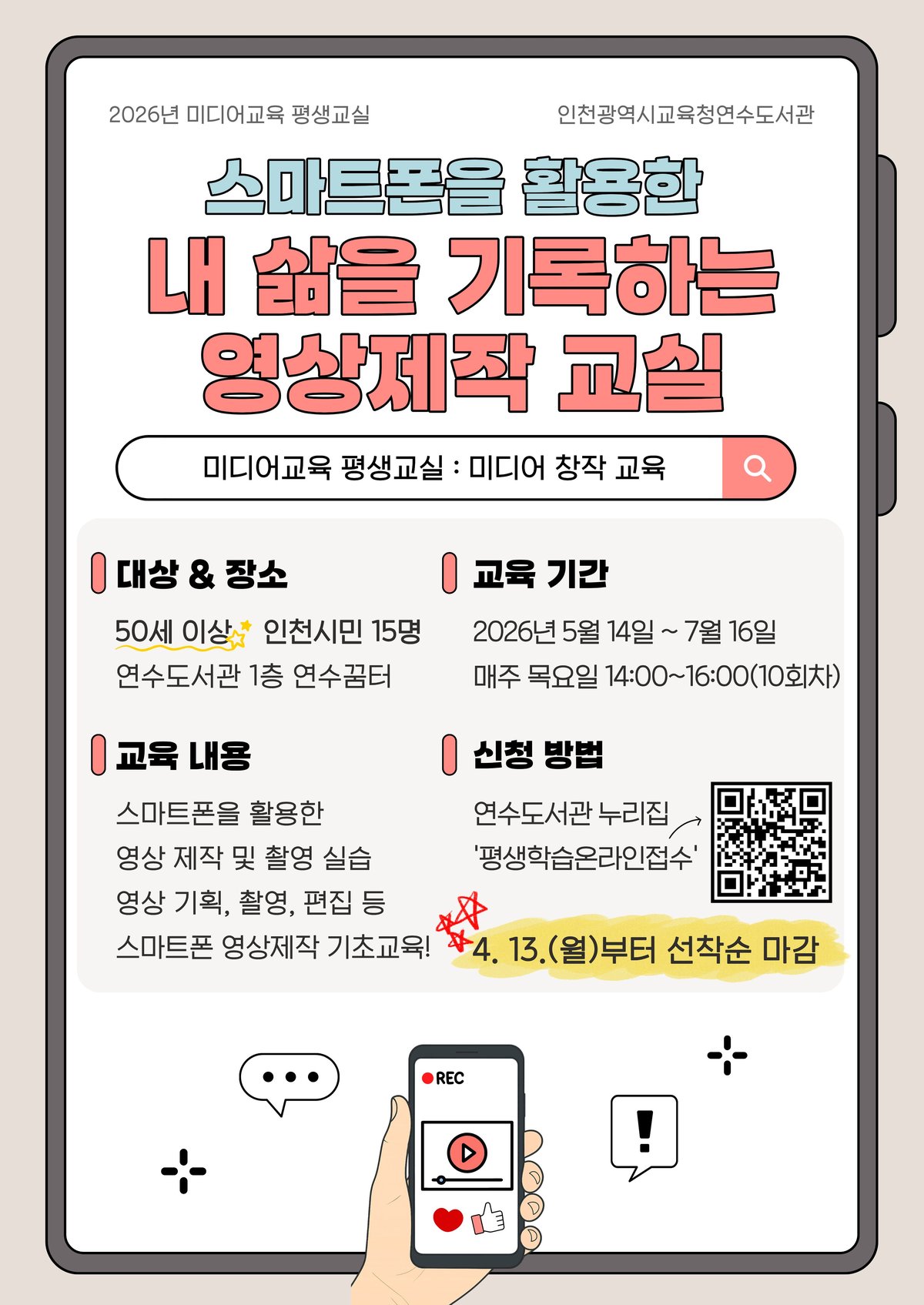 [PEDIEN] 인천광역시교육청연수도서관이 50대 이상 시민을 대상으로 '내 삶을 기록하는 영상제작 교실'을 운영한다.