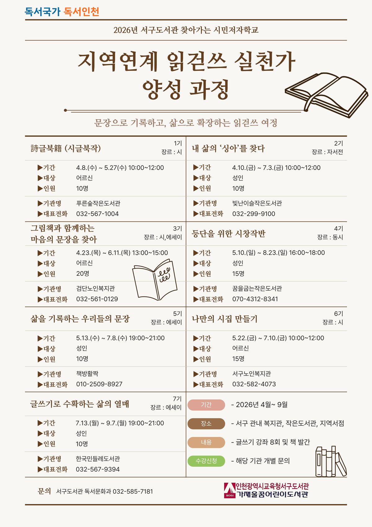 이번 프로그램은 '독서국가, 독서인천' 실현을 목표로, 서구 관내 복지관, 작은도서관, 지역 서점 등과 손잡고 진행된다. 시민들이 일상 속에서 글쓰기를 즐기고, 나아가 시민 저자로 발돋움할 수 있도록 돕는다는 취지다.