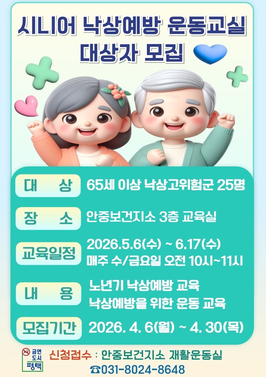 안중보건지소 관계자는 “이번 프로그램이 65세 이상 노년층의 낙상 발생 위험을 줄이고, 2차 장애를 예방하여 건강한 노년 생활을 돕는 데 기여할 것으로 기대한다”고 밝혔다.